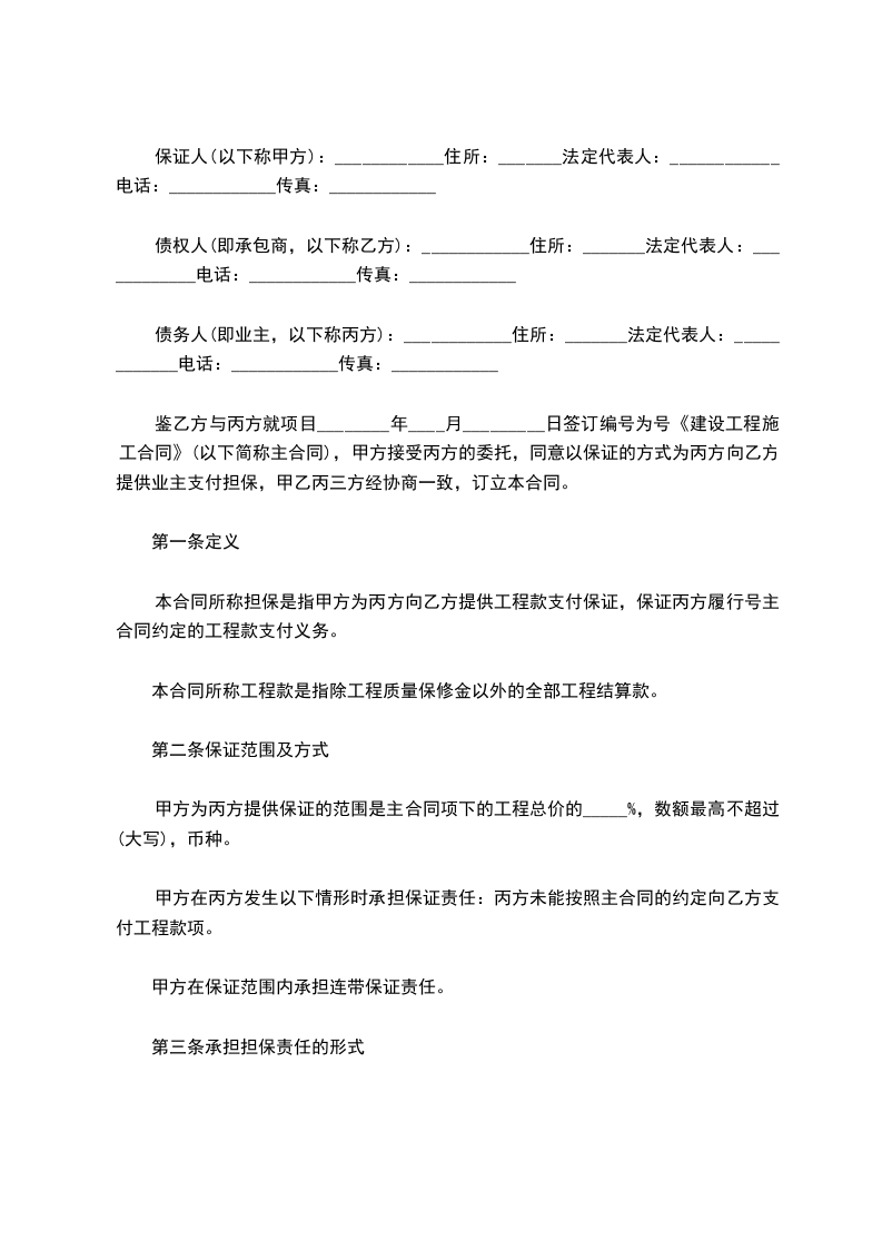 本合同所称担保是指甲方为丙方向乙方提供工程款支付保证,保证丙方履行 号主合同约定的工程款支付义务。