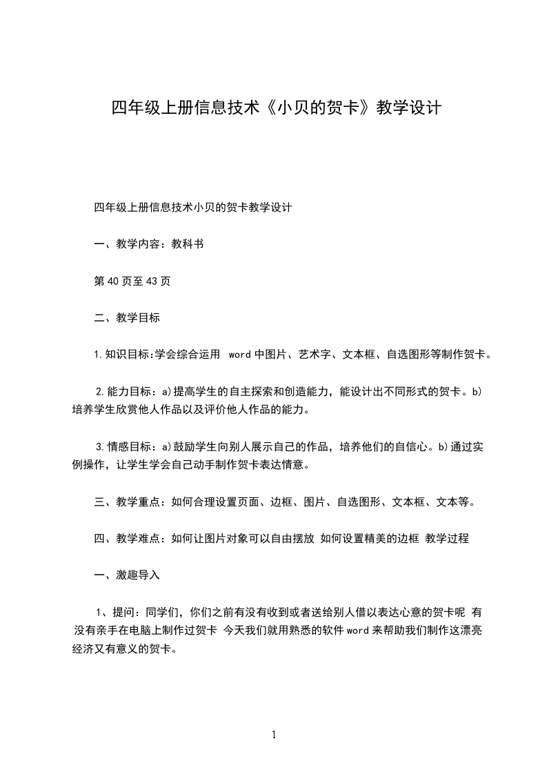 四年级上册信息技术小贝的贺卡教学设计