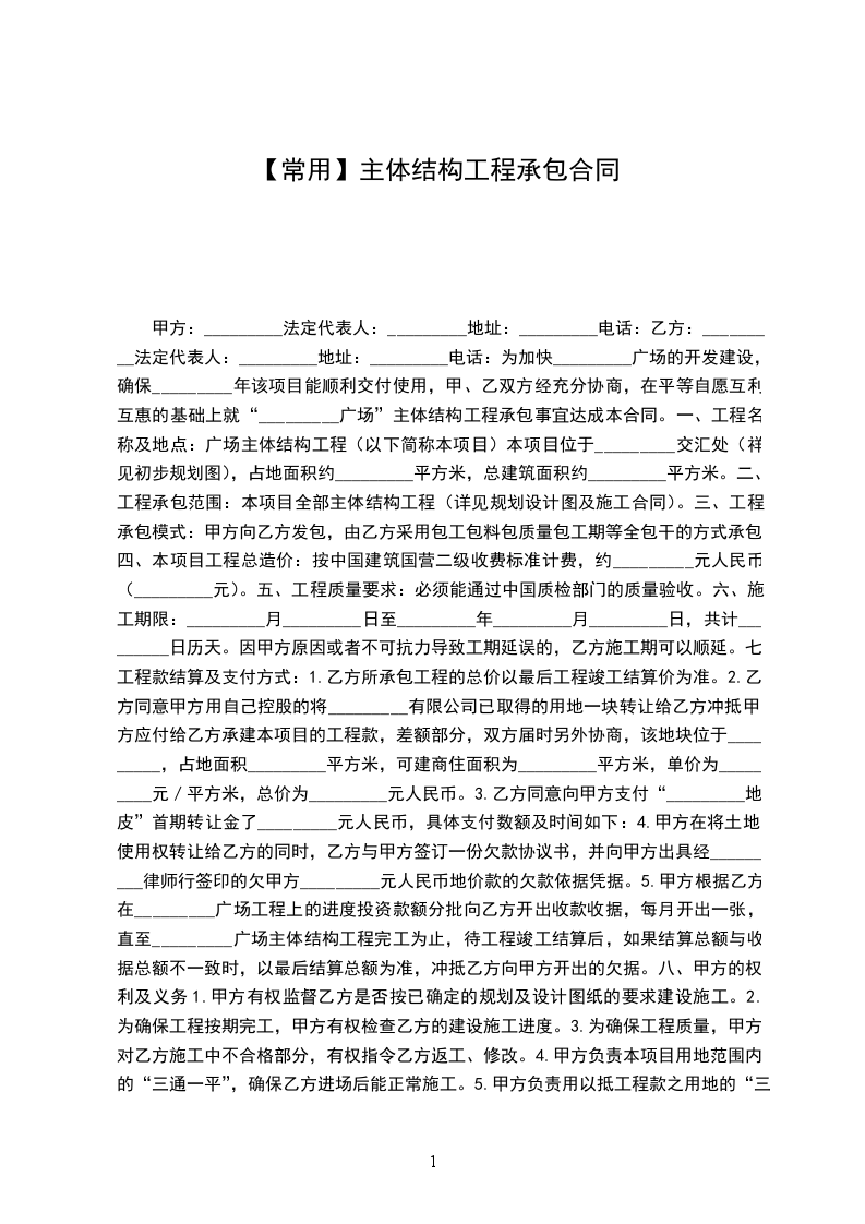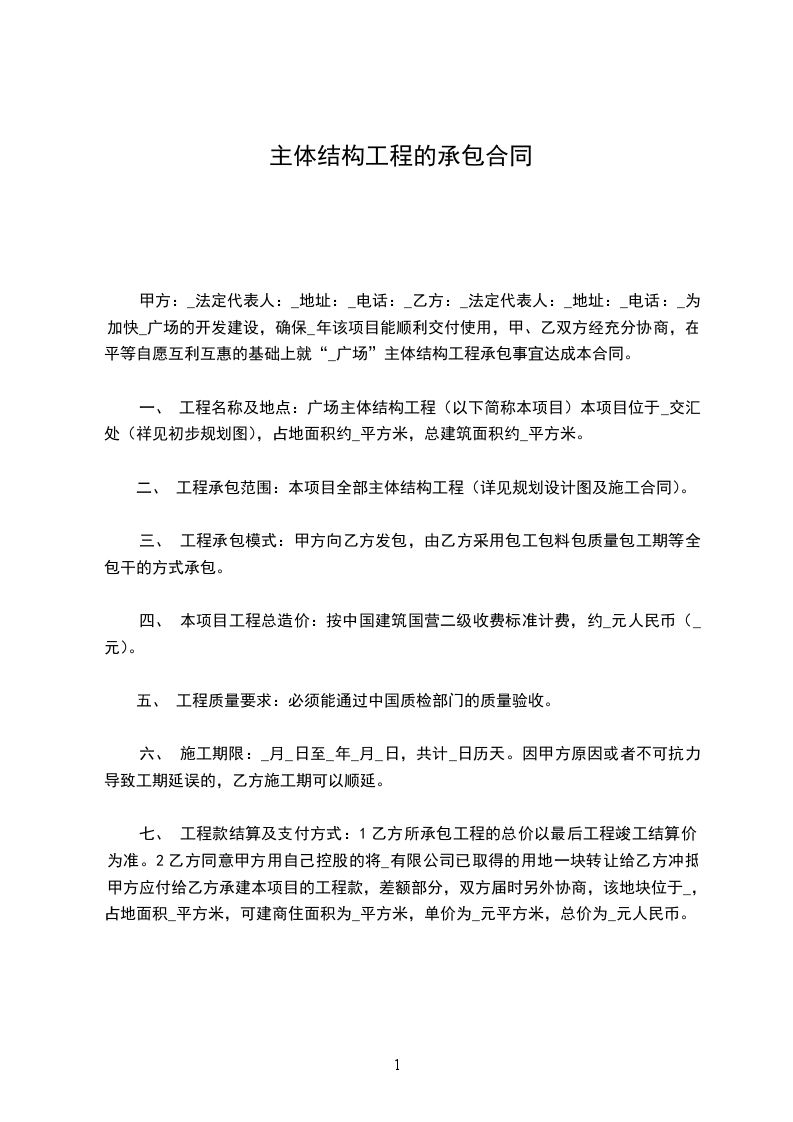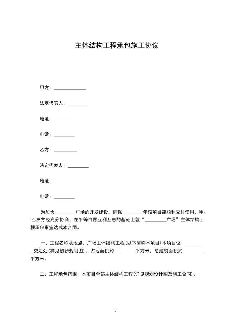 甲方:_法定代表人:_地址:_电话:_乙方:_法定代表人:_地址:_电话:_为加快_广场的开发建设,确保_年该项目能顺利交付使用,甲、乙双方经充分协商,在平等自愿互利互惠的基础上就“_广场”主体结构工程承包事宜达成本合同。
