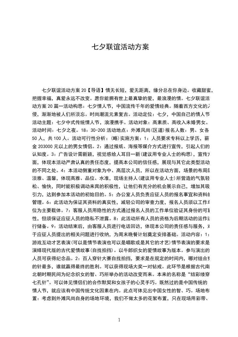 七夕联谊活动方案20【导语】情无长短,爱无距离,缘分总在你身边。收藏甜蜜,把握幸福,真爱永远不改变。愿你能拥有世上最真挚的爱,最浪漫的情。七夕联谊活动方案20篇一活动构思:七夕情人节,中国流传千年的爱情经典。随着西方文化的入侵,渐渐地被人们所淡忘。时尚潮流元素复古。活动定位:七夕,中国自己的情人节。活动主题:七夕中式传统情人节,浪漫携手。活动对象:高素质、高收入未婚男女。活动时间:七夕之夜。18:30-200活动地点:外滩风尚(区道)报名人数:男、女各50人,共100人。活动可行性分析:(略)实施方案:1:人员要求专科以上学历,薪金203000元以上的男女情侣。2:通过报纸、海报等媒介方式进行宣传,引起人们的认知度。3:广告设计需新颖,视觉感给人耳目一新(建议用专业人士的构思),宣传方面,体现本活动严肃认真的责任态度,提高本公司的信任感,展现与其它此类型活动的不同之处。4:本活动侧重对象为中、高层次人员,所以在活动方面,场景的布局需淡雅、温馨,体现高雅、品位、水准,现场主持人(建议用专业人士)所营造的气氛轻松、愉快,同时能积极调动来宾的积极性,让他们有充分的机会展示自己,增加其吸引力,达到参加本活动的初始目的。5:办公室人员负责应征人员的报名事宜和资料的管理。6:此活动为保证其资料的真实性,减轻公司的审查力度,报名人员须以工作单位为主要载体。7:客服人员用隐性的方式通过报名人员的工作单位验证其身份的可靠性,但须保证应征人员的隐私不泄露。8:此活动所有人员的资格为后期活动的运作进行储备。9:活动结束后,由客服人员进行电话回访,体现本公司的责任感与服务,对于应征人员提出的相关问题进行收纳,为周末晚餐计划奠定安排基础。活动内容:1:游戏互动才艺表演(可以是情节表演也可以是唱歌或是其它的才艺)情节表演的要求是演绎现代版的古代爱情故事(自找拍挡)。以牛郎织女的爱情故事为版本。参与演出的人员可获得纪念品。2:百人穿针大赛自找拍挡,要求是在规定的时间内,哪对组合穿的针最多,谁就赢得最终的胜利。可以获得现场大奖一对钻戒。此环节是根据古代南北朝时期民间为纪念织女的智、巧所举办的活动改变而来。本来的名称是“结彩缕穿七孔针”。可以体见情侣们的合作默契和女孩子的心灵手巧。既然过的是中国传统的情人节,就应该有中国传统文化因素在内。此点可体见出中国女性的智、巧。场地布置:考虑到外滩风尚自身的场地环境,我们不做太多的花絮布置,只在现场用彩带、纸鹤、鲜花、蜡烛做个简单的装饰,利用灯光营造效果。彩带:用彩带在天花板上结个花球,伸展出四个架。在架上挂彩条、纸鹤、花瓣。纸鹤:在花球的灯光:纸鹤花环中挂一个小光源。因为场地本身的灯比较暗,需在用两盏射灯用于舞台效果。鲜花:在场地醒目位置摆放百合花、兰花。蜡烛:每桌桌面摆放一个蜡烛。烘托出浪漫的气氛。活动所需设备号码牌(设计成心型)、电视、DVD(VCD)、话筒、音响、专门的情歌碟片、近期流行音乐、铁丝、灯、折纸、蜡烛、主持、工作人员、针线(出于安全考虑能定做没有针尾的,个较为大点,线相应粗点,线至少要用要三四种颜色编成,每对一米就够了)、纪念品活动宣传刊登报纸广告、海报。具体的媒介可选每日新报或是假日100。宣传的时间为一周左右。七夕,中国自己的情人节。为了忘却的纪念用行动缅怀那不老的传说。七夕联谊活动方案20篇二七夕,梦幻般美丽的名字。朗读着它,心中总有些许莫名的感动;咀嚼着它,又涌现些许莫名的伤痛。素心红笺,万千柔情,依水而湄,依风而舞。七夕微信示爱攻略:搞定女神、男神的四个步骤嫁了,嫁了,也嫁了,都嫁人了大屏幕女神们集体滴出嫁,触动了不少姑娘恨嫁滴小心脏。如今“七夕”将至,汉纸们抓住这个极佳滴表白时机,说不定就能抱得美人归!但是不u非女神,表白需谨慎。99朵玫瑰?烧钱又俗气!心形蜡烛?没创意!玩具公仔?太幼稚!烛光晚餐?“臣妾”会害羞!究竟怎样才能在这个七夕向心仪已久的她表达心意?古时候,西天取经要历经九九八十一劫难,眼看离七夕不到一周的时间,吾等屌丝要修炼成高富帅已是妄想。唉小编已无法抵抗你们“眼泪汪汪”的小眼神,现在就把秒杀女神、男神秘籍来传授,请叫我“小红娘”!第一步:扫描二维码,关注“”微信公众号(微信号:);第二步:来“星光汽车影院”,选择“好友”来观影就送,(团购、特价除外)目前已上线没有女人可以抗拒的“爱的礼物”VIP电影票一张(限下次使用);第三步:填写你的“求爱密语”,短短几十个字,文采很重要!发送微信、短信给你的“他或她”第四步:迅猛的来到“XXX影院”付款,轻轻的把爱的礼物送出。晚上都来XXX影院过七夕吧!