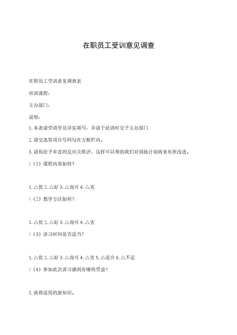 在职员工受训意见调查表