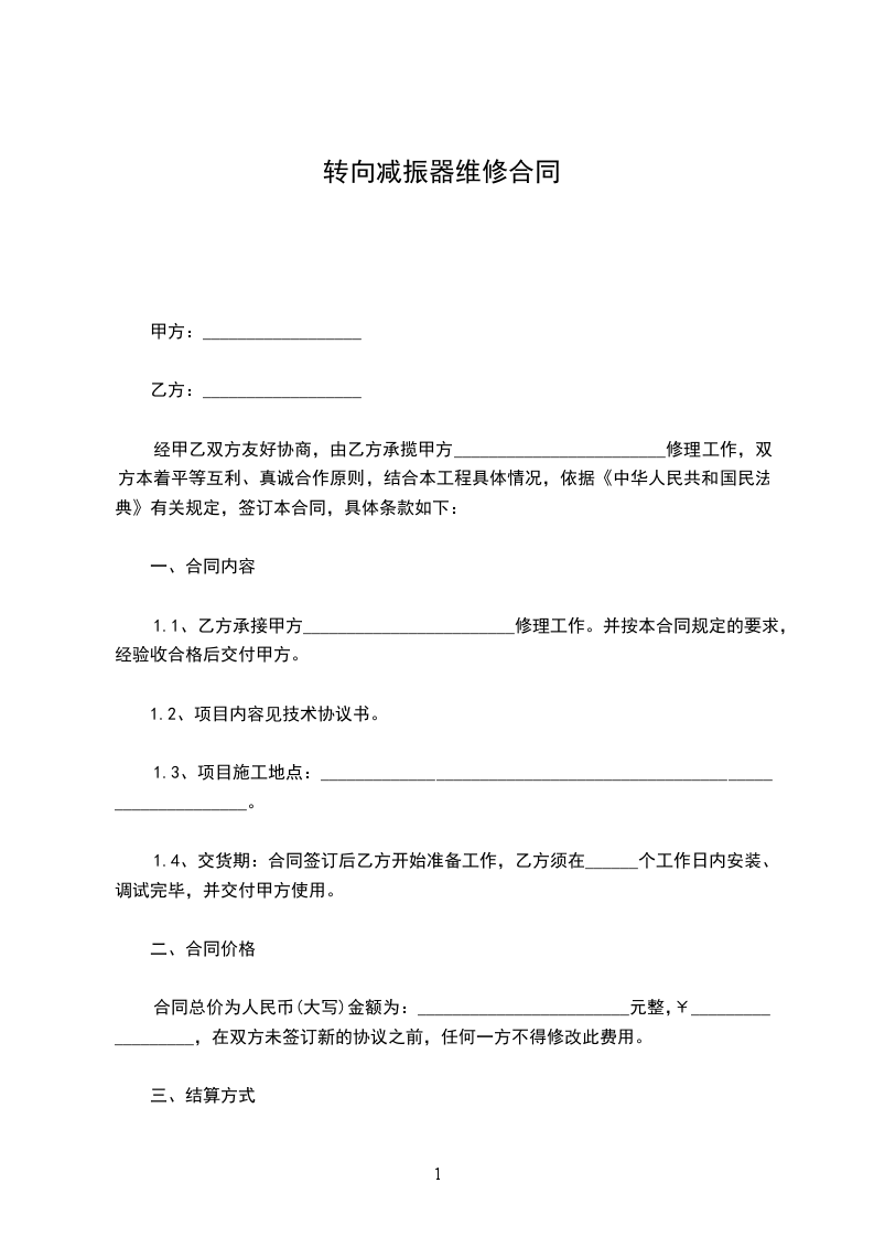 经甲乙双方友好协商,由乙方承揽甲方________________________修理工作,双方本着平等互利、真诚合作原则,结合本工程具体情况,依据《中华人民共和国民法典》有关规定,签订本合同,具体条款如下: