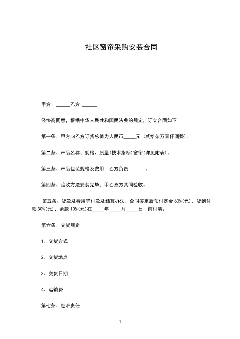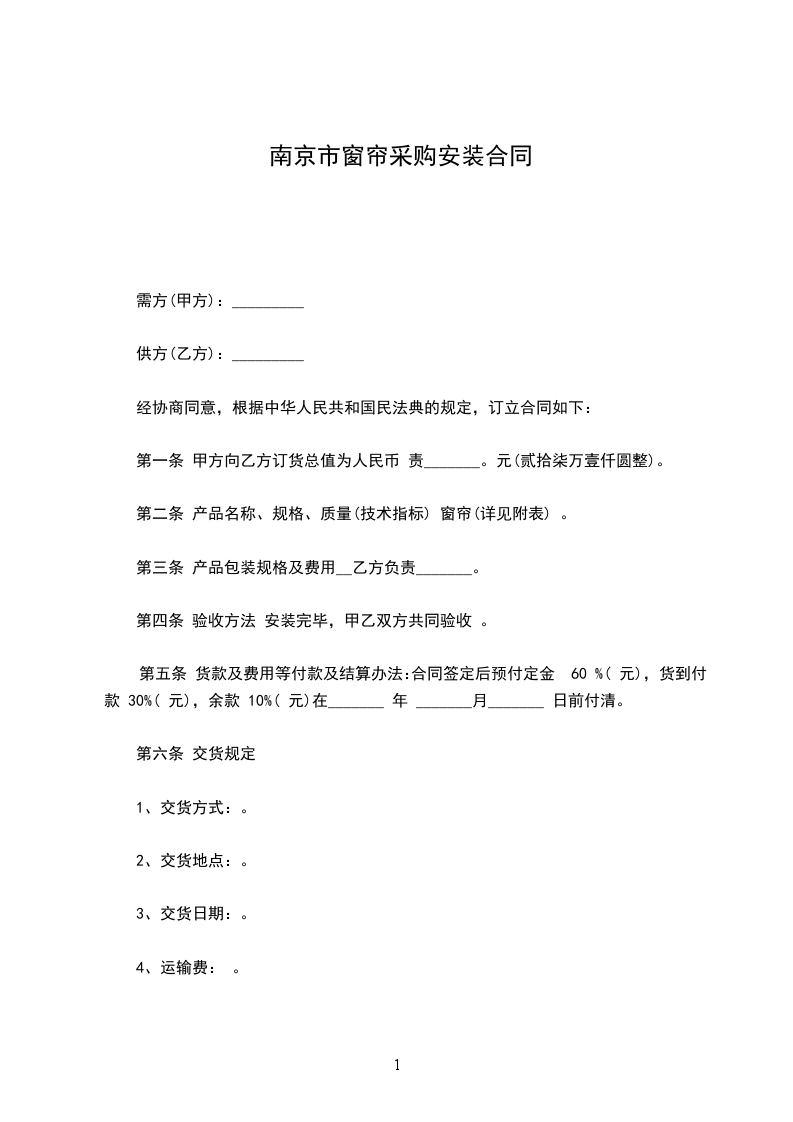 编号:_窗帘采购安装合同甲方:_乙方:_签订日期:_年_月_日采购方:(以下简称:“甲方”)销售方:(以下简称:“乙方”)甲乙双方经友好协商,就乙方为甲方供应窗帘一事,特此订立以下条款,以资双方共同遵照执行。