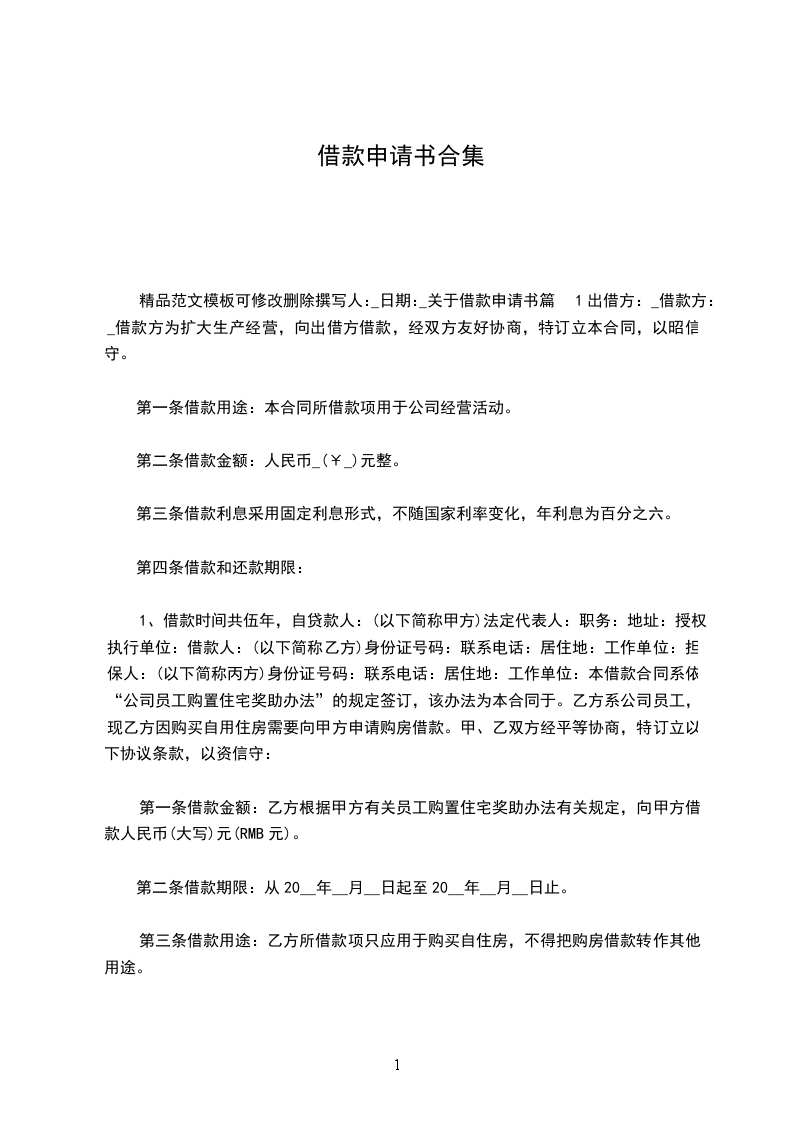 精品范文模板可修改删除撰写人:_日期:_关于借款申请书篇1出借方:_借款方:_借款方为扩大生产经营,向出借方借款,经双方友好协商,特订立本合同,以昭信守。