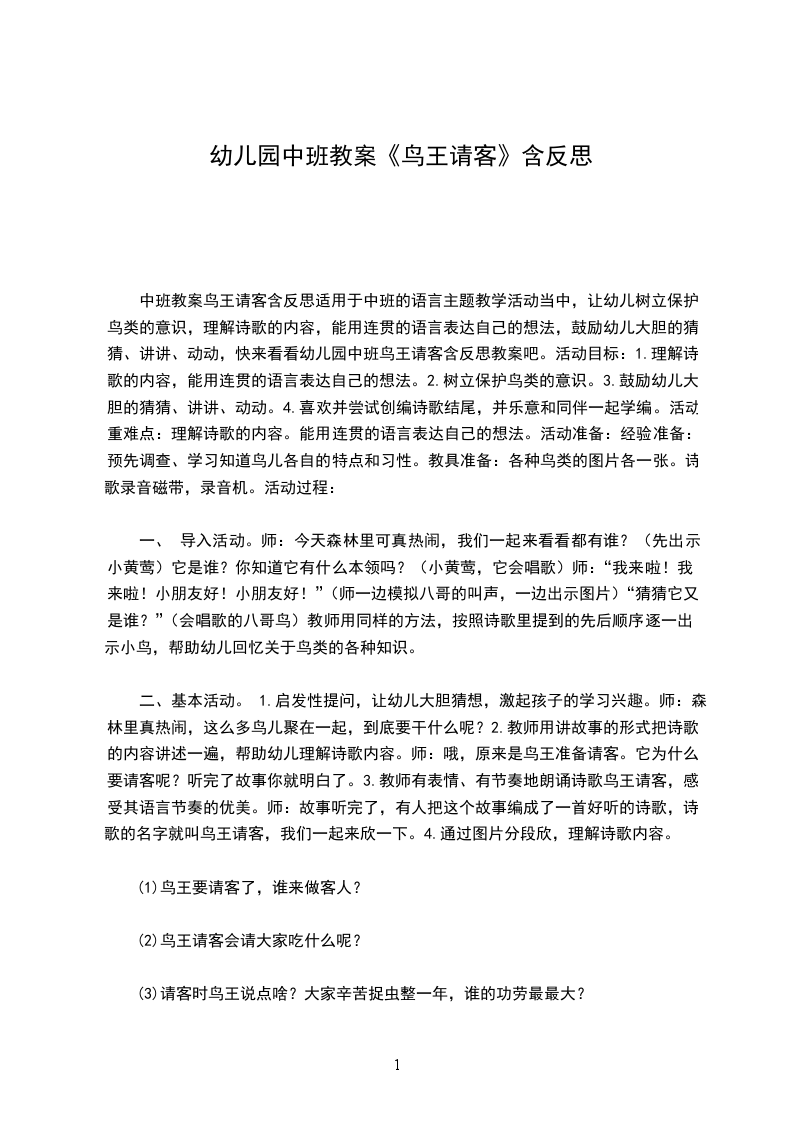 二、 基本活动。1.启发性提问,让幼儿大胆猜想,激起孩子的学习兴趣。师:森林里真热闹,这么多鸟儿聚在一起,到底要干什么呢?2.教师用讲故事的形式把诗歌的内容讲述一遍,帮助幼儿理解诗歌内容。师:哦,原来是鸟王准备请客。它为什么要请客呢?听完了故事你就明白了。3.教师有表情、有节奏地朗诵诗歌鸟王请客,感受其语言节奏的优美。师:故事听完了,有人把这个故事编成了一首好听的诗歌,诗歌的名字就叫鸟王请客,我们一起来欣一下。4.通过图片分段欣,理解诗歌内容。