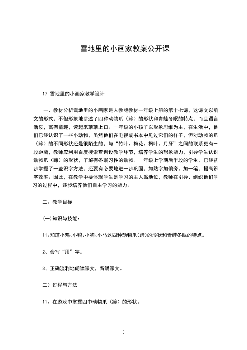 一、教材分析雪地里的小画家是人教版教材一年级上册的第十七课,这课文以韵文的形式,不但形象地讲述了四种动物爪(蹄)的形状和青蛙冬眠的特点,而且语言活泼,富有童趣,读起来琅琅上口。一年级的小孩子以形象思维为主,在生活中,他们已经认识了一些小动物,虽然他们在电视或书本中见过它们的样子,但对动物的爪(蹄)的不同形状还是很陌生的,与“竹叶、梅花、枫叶、月牙”之间的联系更有一段距离,教师应利用百度搜索查创设教学环节,培养学生的想象能力,引导学生认识动物爪(蹄)的形状,了解有冬眠习性的动物。一年级上学期后半段的学生,已经初步掌握了一些识字方法,还要有必要地进一步巩固,如熟字加偏旁、加一笔,提高识字效率。因此,在教学中要体现学生是学习的主人翁地位,教师在引导、组织他们学习的过程中,逐步培养他们自主学习的能力。