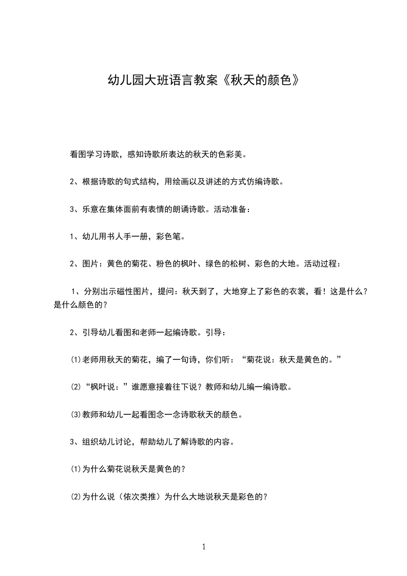 2、图片:黄色的菊花、粉色的枫叶、绿色的松树、彩色的大地。活动过程: