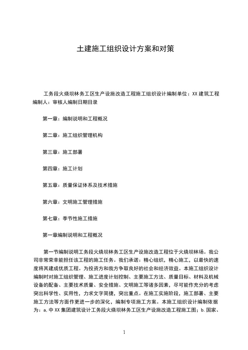 工务段火烧坝林务工区生产设施改造工程施工组织设计编制单位:XX建筑工程编制人:审核人编制日期目录