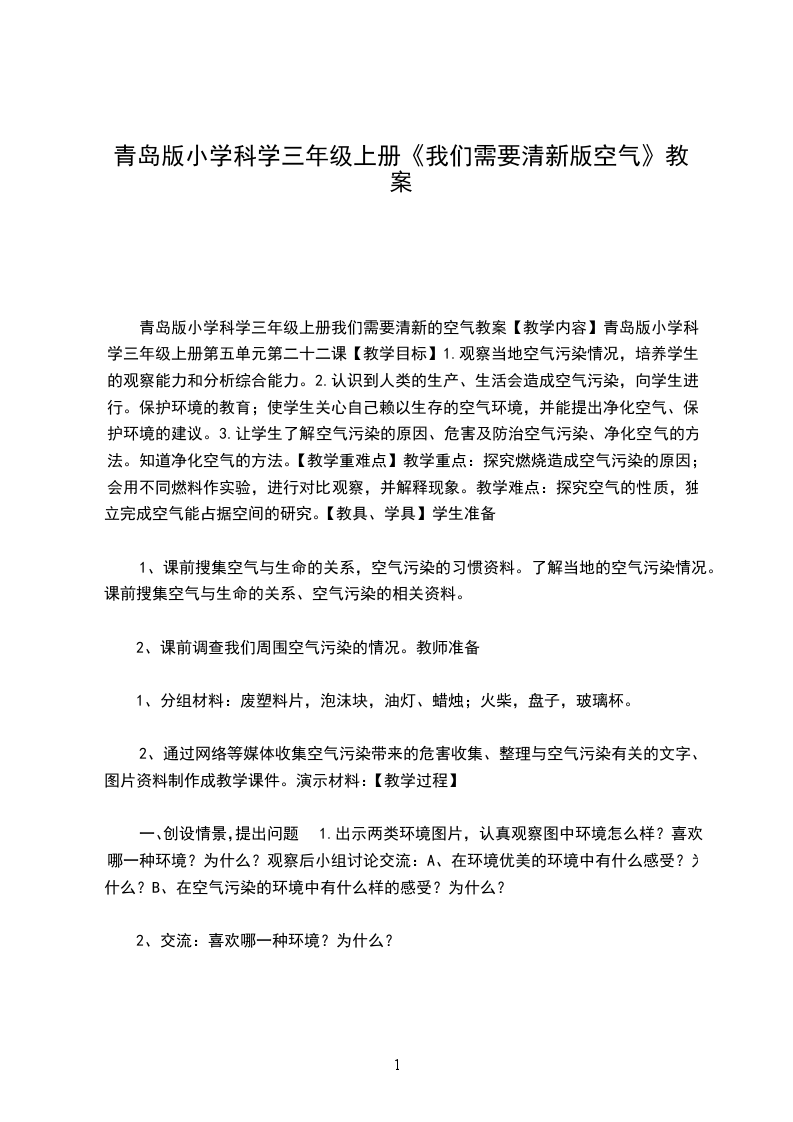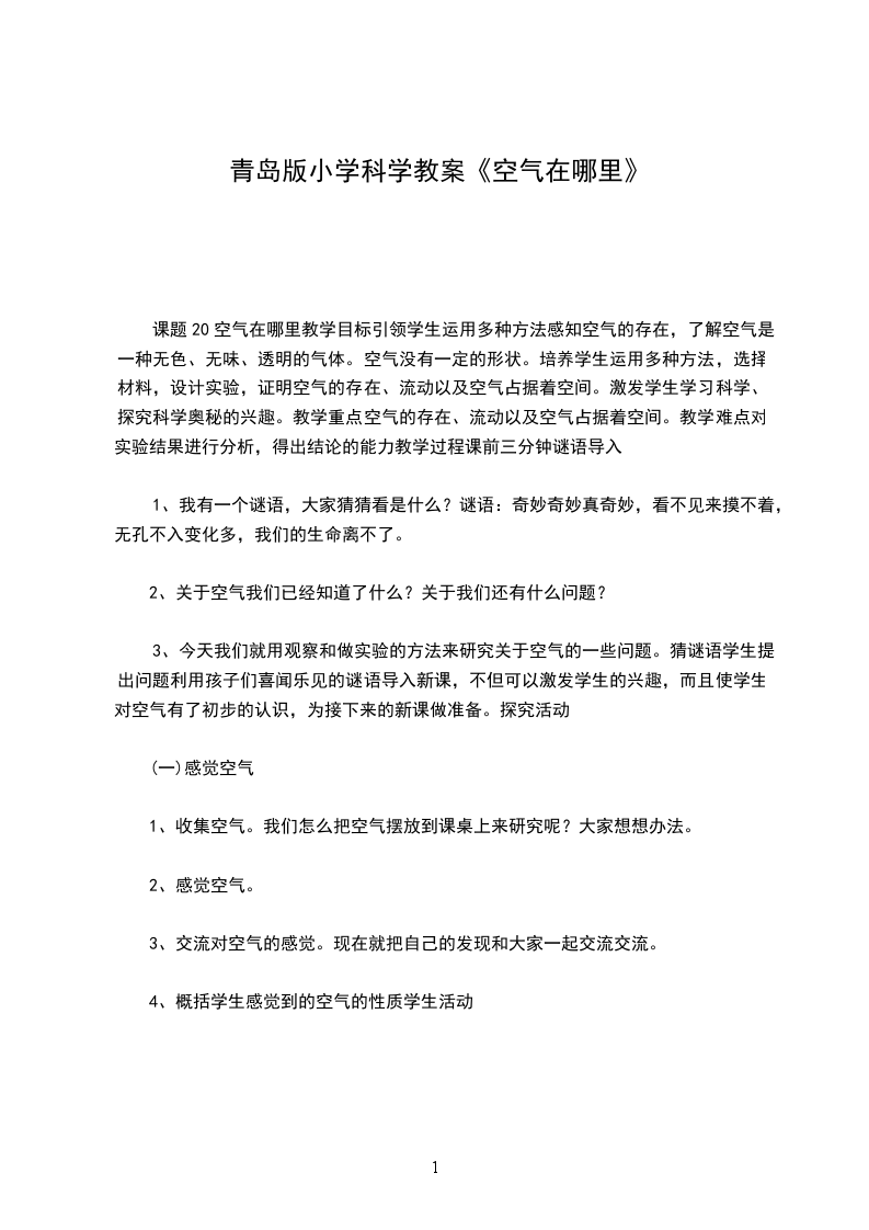 1、情感态度:体会探究空气无处不在的乐趣,并意识到科学探究的无限魅力。、过程与方法:让学生大胆地进行猜测,并引导学生利用提供的材料进行实验设计,能正确地操作,能根据事实进行分析、推导、探索、体会科学探究的基本方法。、科学知识:通过寻找空气,并利用多种感官来感知空气无处不在。教学准备:分组实验材料:粉笔、砖块、风车、试剂瓶、塑料瓶、塑料袋、脸盆、气球、水等。教学过程: