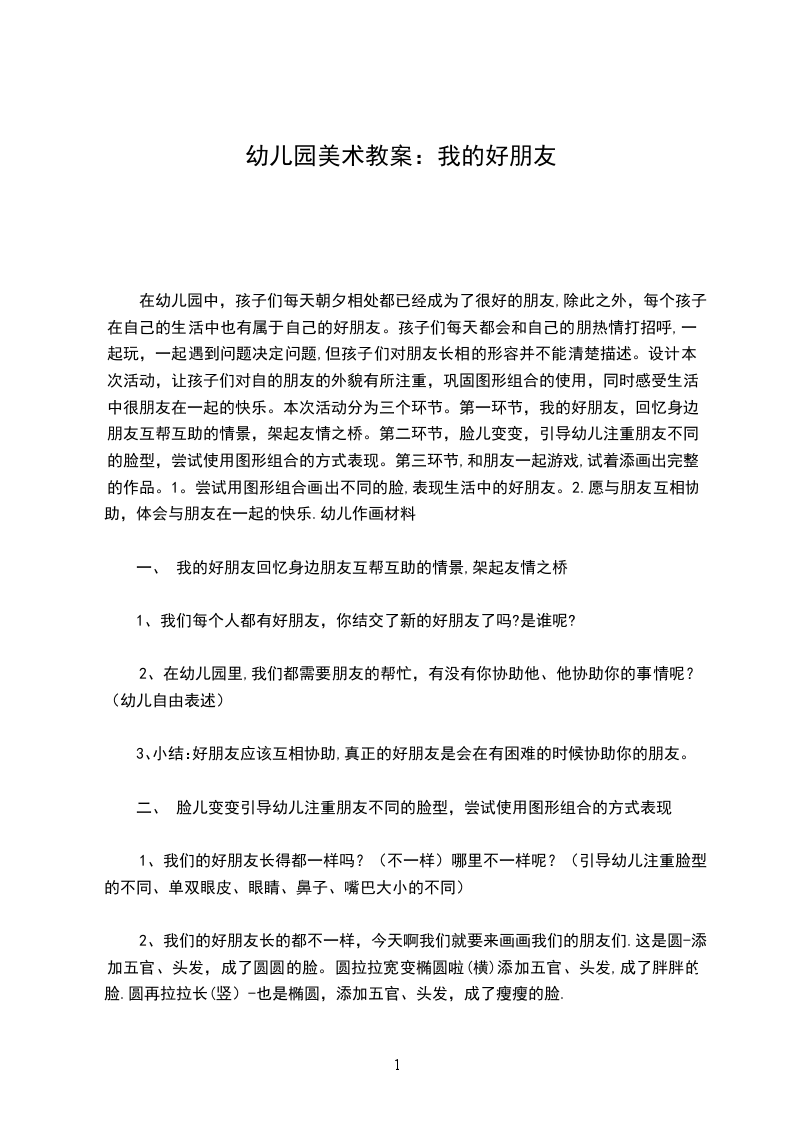 在幼儿园中,孩子们每天朝夕相处都已经成为了很好的朋友,除此之外,每个孩子在自己的生活中也有属于自己的好朋友。孩子们每天都会和自己的朋热情打招呼,一起玩,一起遇到问题决定问题,但孩子们对朋友长相的形容并不能清楚描述。设计本次活动,让孩子们对自的朋友的外貌有所注重,巩固图形组合的使用,同时感受生活中很朋友在一起的快乐。本次活动分为三个环节。第一环节,我的好朋友,回忆身边朋友互帮互助的情景,架起友情之桥。第二环节,脸儿变变,引导幼儿注重朋友不同的脸型,尝试使用图形组合的方式表现。第三环节,和朋友一起游戏,试着添画出完整的作品。1。尝试用图形组合画出不同的脸,表现生活中的好朋友。2.愿与朋友互相协助,体会与朋友在一起的快乐.幼儿作画材料