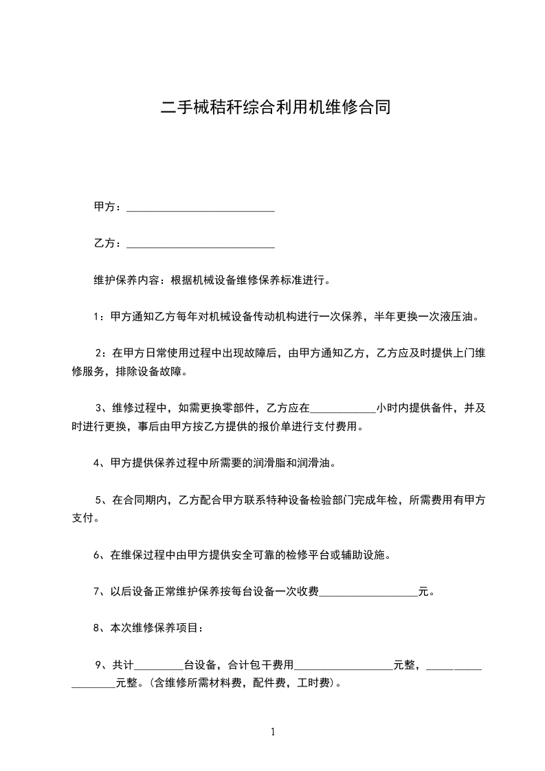 械秸秆综合利用机定做合同