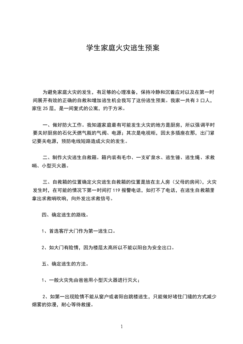 为避免家庭火灾的发生,有足够的心理准备,保持冷静和沉着应对以及在第一时间展开有效的正确的自救和增加逃生机会我写了这份逃生预案。我家一共有3口人,家住25层,是一间复式的公寓,约于方米。