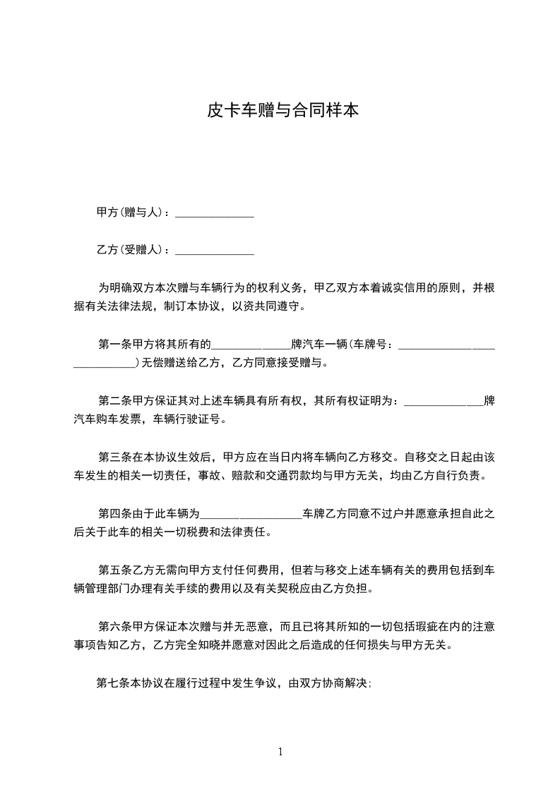 一、甲方将其所有的汽车赠送给乙方,其所有权证明为:___________________________________。