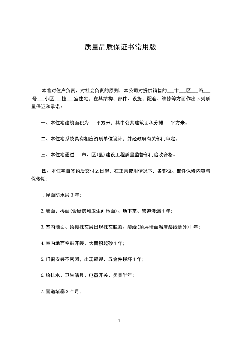 本着对住户负责、对社会负责的原则,本公司对提供销售的___市___区___路___号___小区___幢___室住宅,在其结构、部件、设施、配套、维修等方面作出下列质量保证和承诺: