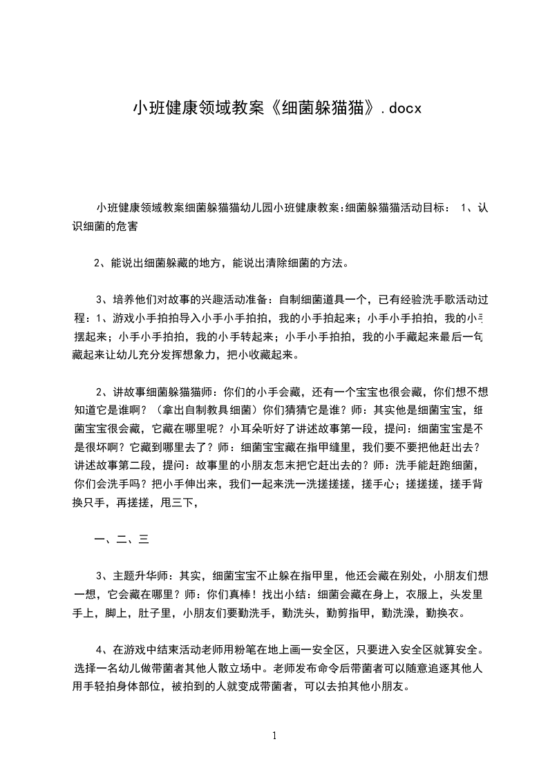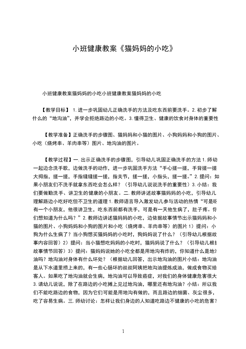 【教学过程】一.出示正确洗手的步骤图,引导幼儿巩固正确洗手的方法1.师幼一起边念洗手歌,边做洗手的动作,进一步巩固洗手方法“手心搓一搓,手背搓一搓,大拇指,搓一搓,手指缝缝搓一搓,指关节,搓一搓,小指头,搓一搓。”2.提问:如果小朋友们不洗手就拿东西吃会怎么样?(引导幼儿说说洗手的重要性)3.小结:我们要做勤洗手、讲卫生的健康的小朋友。二.教师讲述故事猫妈妈的小吃,引导幼儿理解路边小吃好吃但不卫生的道理1.教师语言导入激发幼儿参与活动的热情“可是呀,有一个小朋友,他很讲卫生,吃东西前都有洗手,可是有一天他生病了,肚子疼。你们想知道为什么吗?”2.教师边讲述猫妈妈的小吃,边依据故事情节出示猫妈妈和小猫的图片、小狗妈妈和小狗的图片和小吃(烧烤串、羊肉串等)的图片1)提问:小狗为什么生病了?当小狗想买猫妈妈的小吃时,狗妈妈说了什么?(引导幼儿根据故事内容回答)2)提问:当小猫想吃妈妈的小吃时,猫妈妈说了什么?(引导幼儿根据故事情节回答)3)提问:猫妈妈说她的小吃全都是用地沟有炸的,你知道什么是地沟油吗?地沟油对身体有什么坏处?(根据幼儿回答,出示地沟油的图片小结:地沟油是从下水道里捞上来的,有一些心肠坏的叔叔阿姨把地沟油提炼成油,做成食物买给客人。如果吃了地沟油就会生病,地沟油可以导致癌症,对我们的身体健康危害很大3.请幼儿说说,除了在路边的小吃摊上见过地沟油,哪里还有地沟油?小结:所以我们不能吃路边的食物,因为它们可能是用地沟有做的,而且路边的细菌、灰尘很多,吃了容易生病。三.师幼讨论:怎样让我们身边的人知道吃路边不健康的小吃的危害?1.请小朋友回家告诉自己的朋友和亲人。2.制作食品安全、健康的标志,让更多人知道。