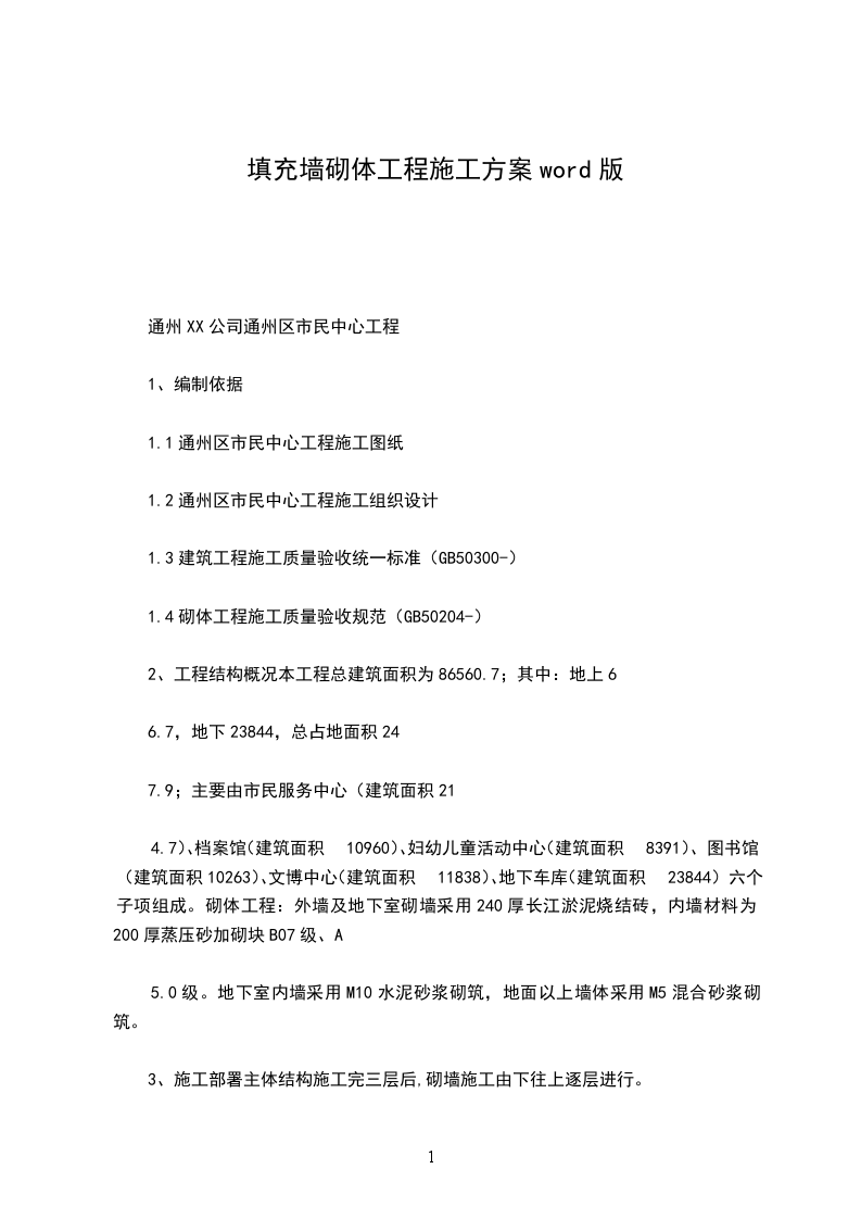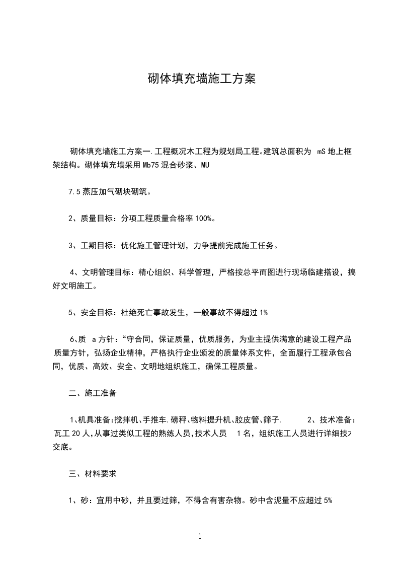 3、4项,在检验批中抽检10%,且不应少于5处。表4.2.1填充墙砌体一般尺寸允许偏差项次项目允许偏差(mm)检验方法轴线位移10用尺检查1垂直度小于或等于3m5用2m托线板或吊线,尺检查大于3m102表面平整度8用2m靠尺和楔形塞尺检查3门窗洞口高、宽(后塞口)5用尺检查4外墙上、下窗口偏移于纬仪或吊线检查蒸压加气混凝土砌块砌体不应与其他块材混砌。抽检数量:在检验批中抽检于且不应少于5处。合肥XX公司1#生产车间工程施工方案检验方法:外观检查。填充墙砌体的砂浆饱满度及检验方法应符合表的规定。抽检数量:每步架子不少于3处,且每处不应少于3块。表4.2.2填充墙砌体的砂浆饱满度及检验方法砌体分类灰缝饱满度及要求检验方法空心砖砌体水平80%采用百格网检查块材底面垂直填满砂浆,不得有透明缝、瞎缝、假缝砂浆的粘结痕迹面积填充墙砌体留置的拉结钢筋的位置应与块体皮数相符合。拉结钢筋应置于灰缝中,埋置长度应符合设计要求,竖向位置偏差不应超过一皮高度。抽检数量:在检验批中抽检于且不应少于5处。检验方法:观察和用尺量检查。填充墙砌筑时应错缝搭砌。抽检数最:在检验批的标准间中抽查10%,且不应少于3间。检查方法:观察和用尺检查。填充墙砌体的灰缝厚度和宽度应正确。空心砖砌体灰缝应为812。抽检数量:在检验批的标准间中抽查10%,且不应少于3间。检查方法:用尺量5皮空心砖或小砌块的高度和2m砌体长度折算。填充墙砌至接近梁、板底时,应留一定空隙,待填充墙砌筑完并应至少间隔7d后,再将其补砌挤紧。抽检数量:每验收批抽10%填充墙片(每两柱间的填充墙为一墙片),且不应少于3片墙。合肥XX公司1#生产车间工程施工方案检验方法:观察检查。4.3质量记录材料(空心砖、实心砖、水泥、砂、钢筋等)的出厂合格证、试验报告。砂浆试块试验报告。检验批质量检验记录。隐检、预检记录。冬期施工记录。设计变更及洽商记录。其它技术文件。4.4砂浆试块控制:砌筑砂浆试块抗压强度平均值必须大于或等于设计强度等级所对应的立方体抗压强度;同一验收批砂浆试块抗压强度的最小一组平均值必须大于或等于设计强度等级所对应的立方体抗压强度的0.75倍。注:砌筑砂浆的验收批,同一类型、强度等级的砂浆试块应不少于3组。当同一验收批只有一组试块时,该组试块抗压强度的平均值必须大于或等于设计强度等级所对应的立方体抗压强度。砂浆强度应以标准养护,龄期为28d的试块抗压试验结果为准。3抽检数量:每一检验批且不超过250m砌体的各种类型及强度等级的砌筑砂浆,每台搅拌机应至少抽检一次。检验方法:在砂浆搅拌机出料口随机取样制作砂浆试块(同盘砂浆只应制作一组试块),最后检查试块强度试验报告单。合肥XX公司1#生产车间工程施工方案