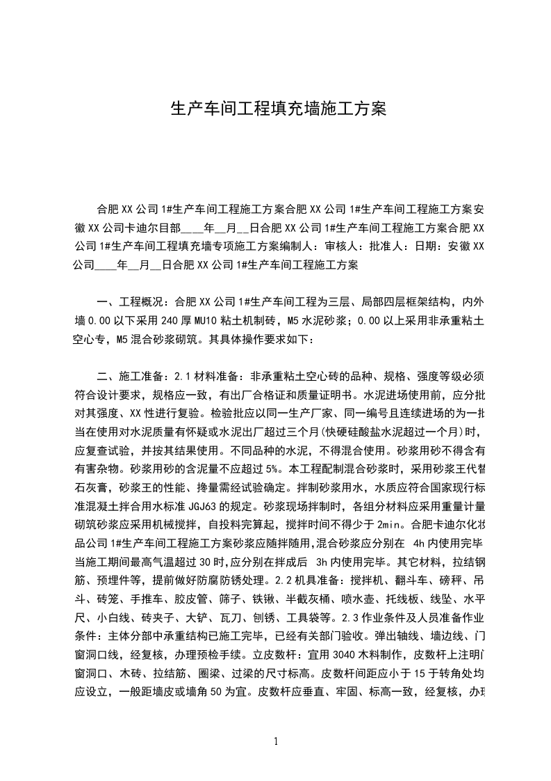 合肥XX公司1#生产车间工程施工方案合肥XX公司1#生产车间工程施工方案安徽XX公司卡迪尔目部____年__月__日合肥XX公司1#生产车间工程施工方案合肥XX公司1#生产车间工程填充墙专项施工方案编制人:审核人:批准人:日期:安徽XX公司____年__月__日合肥XX公司1#生产车间工程施工方案