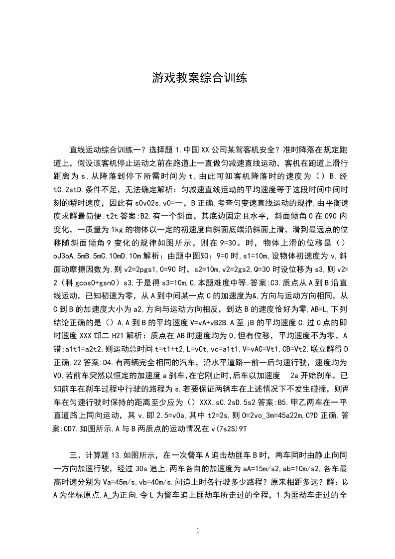 直线运动综合训练一?选择题1.中国XX公司某驾客机安全?准时降落在规定跑道上,假设该客机停止运动之前在跑道上一直做匀减速直线运动,客机在跑道上滑行距离为s,从降落到停下所需时间为t,由此可知客机降落时的速度为()B.经tC.2stD.条件不足,无法确定解析:匀减速直线运动的平均速度等于这段时间中间时刻的瞬时速度,因此有s0v02s,v0=一,B正确.考查匀变速直线运动的规律,由平衡速度求解最简便.t2t答案:B2.有一个斜面,其底边固定且水平,斜面倾角0在090内变化,一质量为1kg的物体以一定的初速度自斜面底端沿斜面上滑,滑到最远点的位移随斜面倾角9变化的规律如图所示,则在9=30。时,物体上滑的位移是()oJ3oA.5mB.5mC.10mD.10m解析:由题中图知:9=0时,s1=10m,设物体初速度为v,斜面动摩擦因数为,则v2=2pgs1,0=90时,s2=10m,v2=2gs2,Q=30时设位移为s3,则v2=2(科gcos0+gsn0)s3,于是得s3=10m,C.本题难度中等.答案:C3.质点从A到B沿直线运动,已知初速为零,从A到中间某一点C的加速度为&,方向与运动方向相同,从C到B的加速度大小为a2,方向与运动方向相反,到达B的速度恰好为零,AB=L,下列结论正确的是()A.A到B的平均速度V=vA+vB2B.A至jB的平均速度C.过C点的即时速度XXX邙二H21解析:质点在AB时速度均为0,但有位移,平均速度不为零,A错;a1t1=a2t2,则运动总时间t=t1+t2,L=vCt,vc=a1t1,V=vAC=Vt1,CB=Vt2,联立解得D正确.22答案:D4.有两辆完全相同的汽车,沿水平道路一前一后匀速行驶,速度均为V0,若前车突然以恒定的加速度a刹车,在它刚止时,后车以加速度2a开始刹车,已知前车在刹车过程中行驶的路程为s,若要保证两辆车在上述情况下不发生碰撞,则两车在匀速行驶时保持的距离至少应为()XXX.sC.2sD.5s2答案:B5.甲乙两车在一平直道路上同向运动,其v,即2.5=v0a,其中t2=2s,则O=2vo_3m=45a22m,C?D正确.答案:CD7.如图所示,A与B两质点的运动情况在v(7s2S)9T