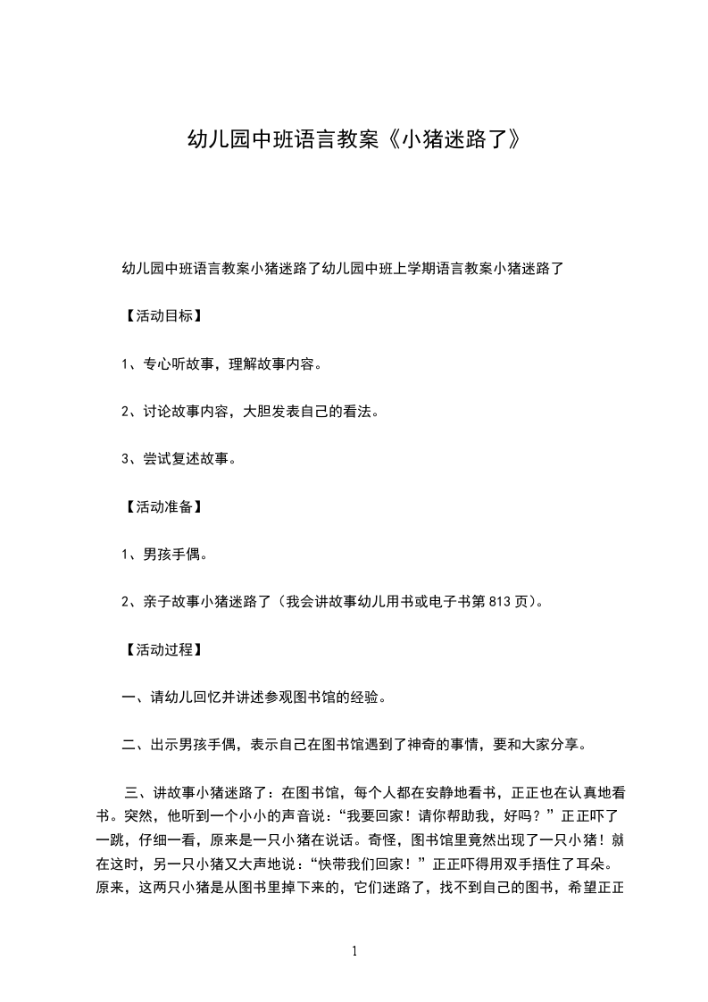 幼儿园中班语言教案小猪迷路了幼儿园中班上学期语言教案小猪迷路了