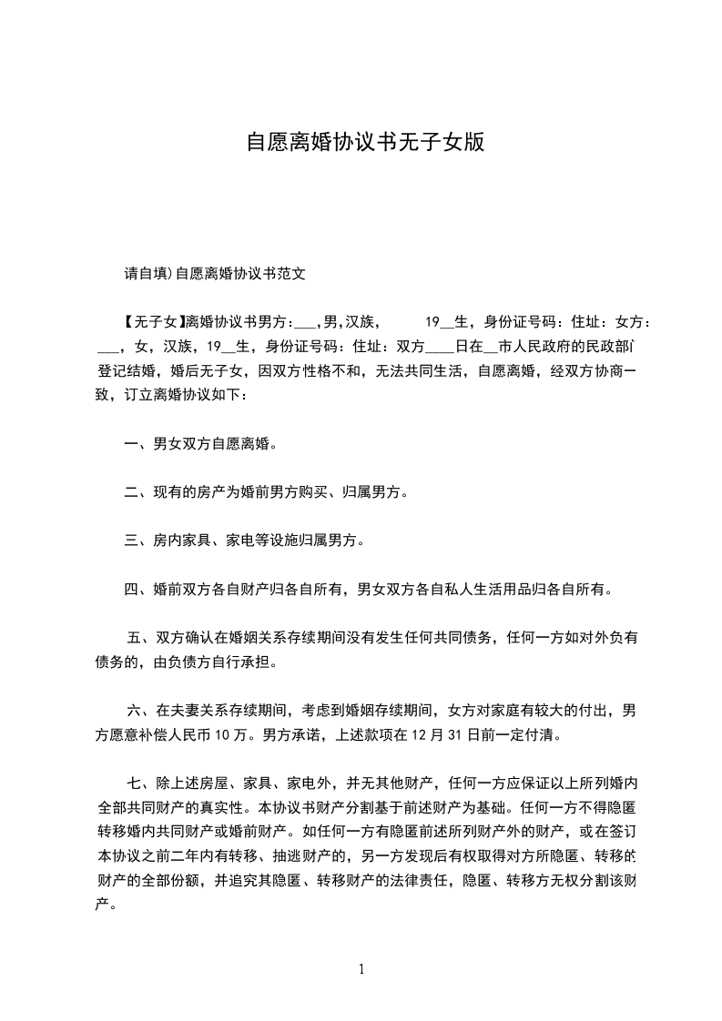 十、如本协议生效后在执行中发生争议的,双方应协商解决,协商不成,任何一方均可向女方所在地人民法院起诉。男方:(签名)女方:(签名)____日____日无财产无子女离婚协议书于请自填)甲方(男方)姓名:_性别:_身份证号码:_住址:_乙方(女方)姓名:_性别:_身份证号码:_住址:_甲乙双方于_年_日在_市_区民政局登记结婚,甲乙双方无财产、无子女。现因双方_不和,导致夫妻双方感情已然完全破裂,已无法继续共同生活,故双方自愿离婚并达成以下协议: