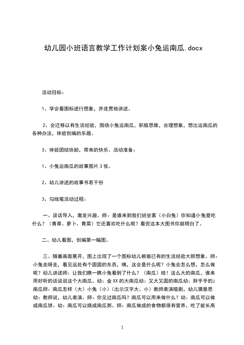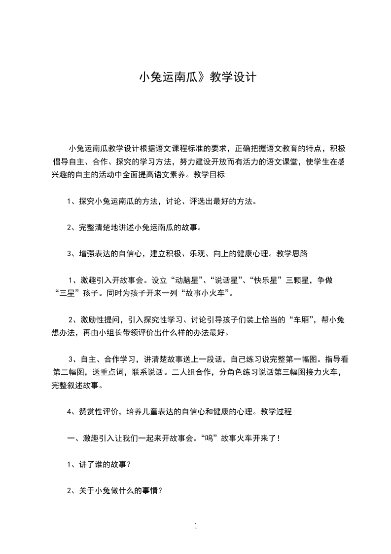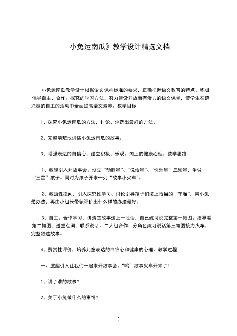 六、 交际范例:小兔运南瓜一天早上,兔妈妈叫小兔去找点吃的。小兔来到南瓜地里,一看,一个又大又黄的南瓜躺在地上。小兔围着南瓜走了几圈,一手摸着后脑勺,发愁了:怎么才能把这个大南瓜运回家呢?小兔心里一亮:车轮是圆的,可以滚动,那南瓜不也是圆的吗?小兔把手放在南瓜两边,把南瓜竖起来推回了家。小兔敲敲门,“咚咚咚”,兔妈妈开门一看,家门口放着一个又大又黄的南瓜。兔妈妈问:“你是怎么把南瓜运回家的呢?”小兔告诉了妈妈,兔妈妈伸出大拇指,夸小兔是个聪明能干的孩子。(1-2)(3-4)(5-8)(9-11)(12-13)板书设计小兔运南瓜大胆说出自己的想法请动物帮忙滚着走用棍子移动成功之处:教师巧妙地采用弱化不成功方法和不给出最优答案而只给予普遍鼓励的办法,让每位学生有交流的机会,有利于调动学生的学习积极性,激发其思维的活跃性,克服课堂出现只限于优生施展才能空间的弊端,也给学生的后续思考留下了充分的空间。不足之处:规范教师的语言。说话时应该尽量简炼,评价语应该尽量多元化。