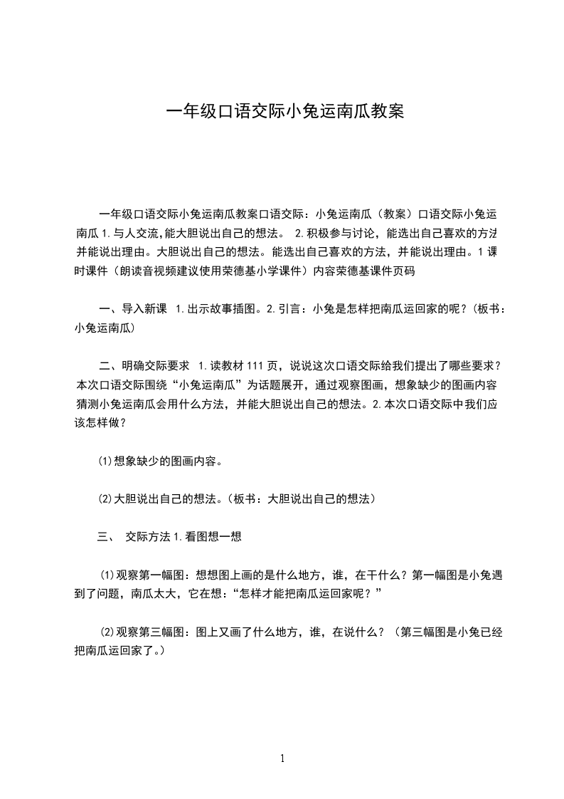 一年级口语交际小兔运南瓜教案口语交际:小兔运南瓜(教案)口语交际小兔运南瓜1.与人交流,能大胆说出自己的想法。2.积极参与讨论,能选出自己喜欢的方法,并能说出理由。大胆说出自己的想法。能选出自己喜欢的方法,并能说出理由。1课时课件(朗读音视频建议使用荣德基小学课件)内容荣德基课件页码