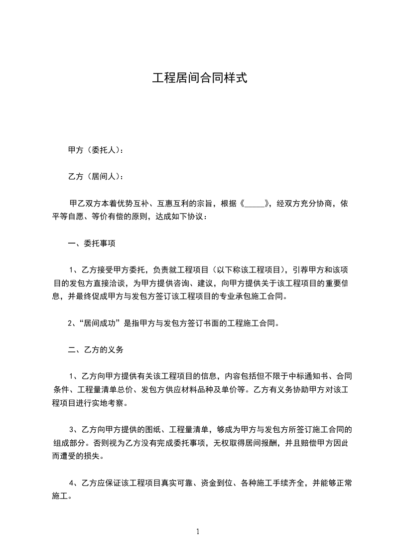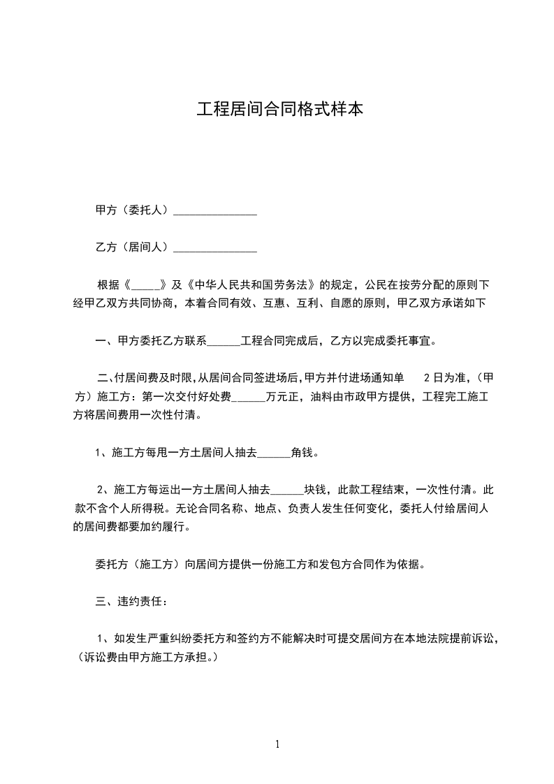 五、甲乙双方共同遵守合同约定,如违约甲方应赔付给对方一定的违约金,按工程合同居间费的.总额的______%赔付违约金,(甲方在施工安全相关的法律责任上,居间人概不负任何责任),大合同签订后,本合同执行同等法律效力。