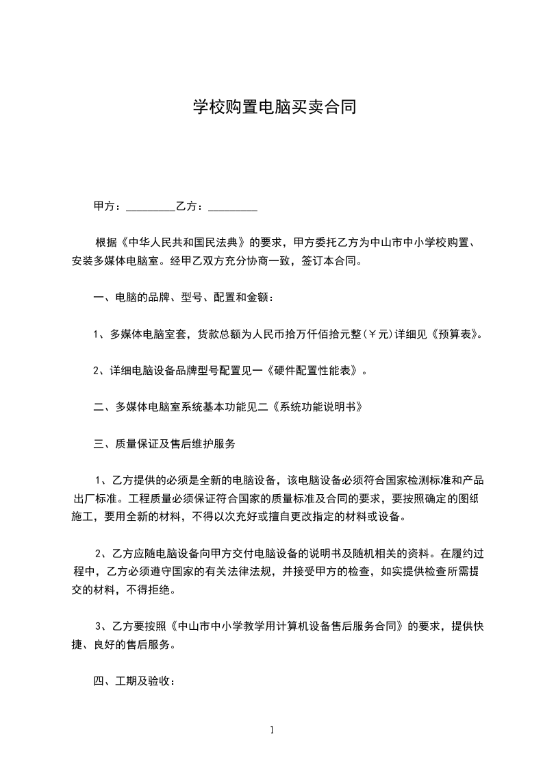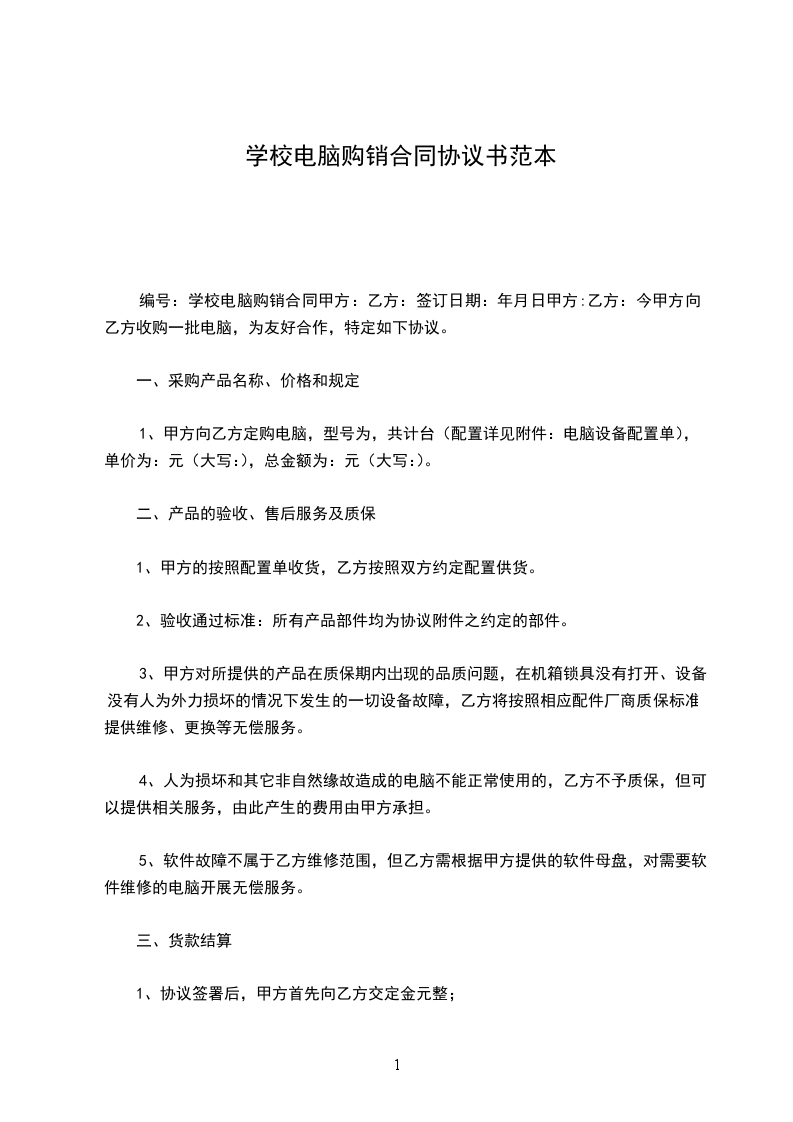 1、甲方向乙方定购电脑,型号为,共计台(配置详见于:电脑设备配置单),单价为:元(大写:),总金额为:元(大写:)。