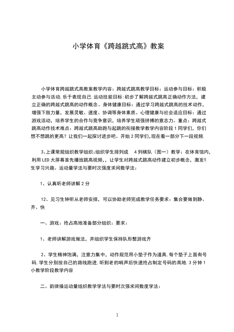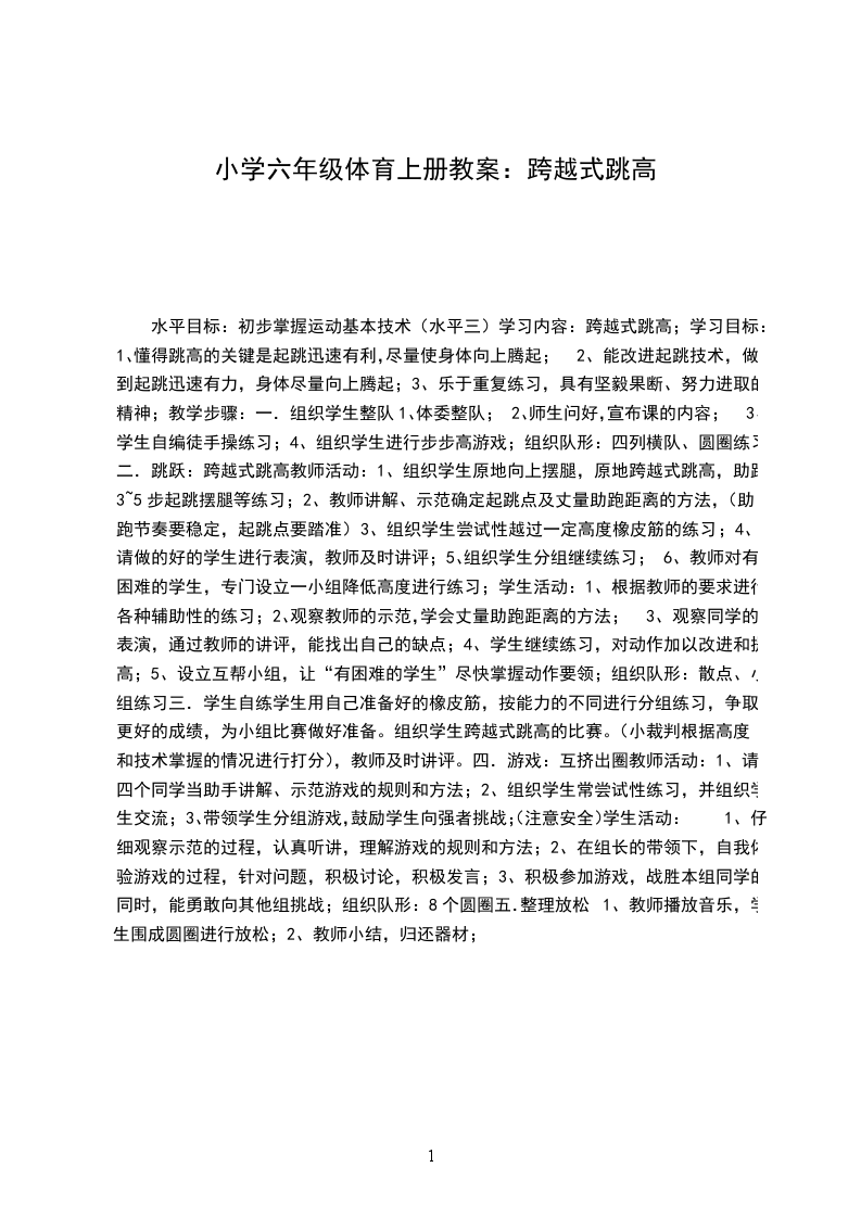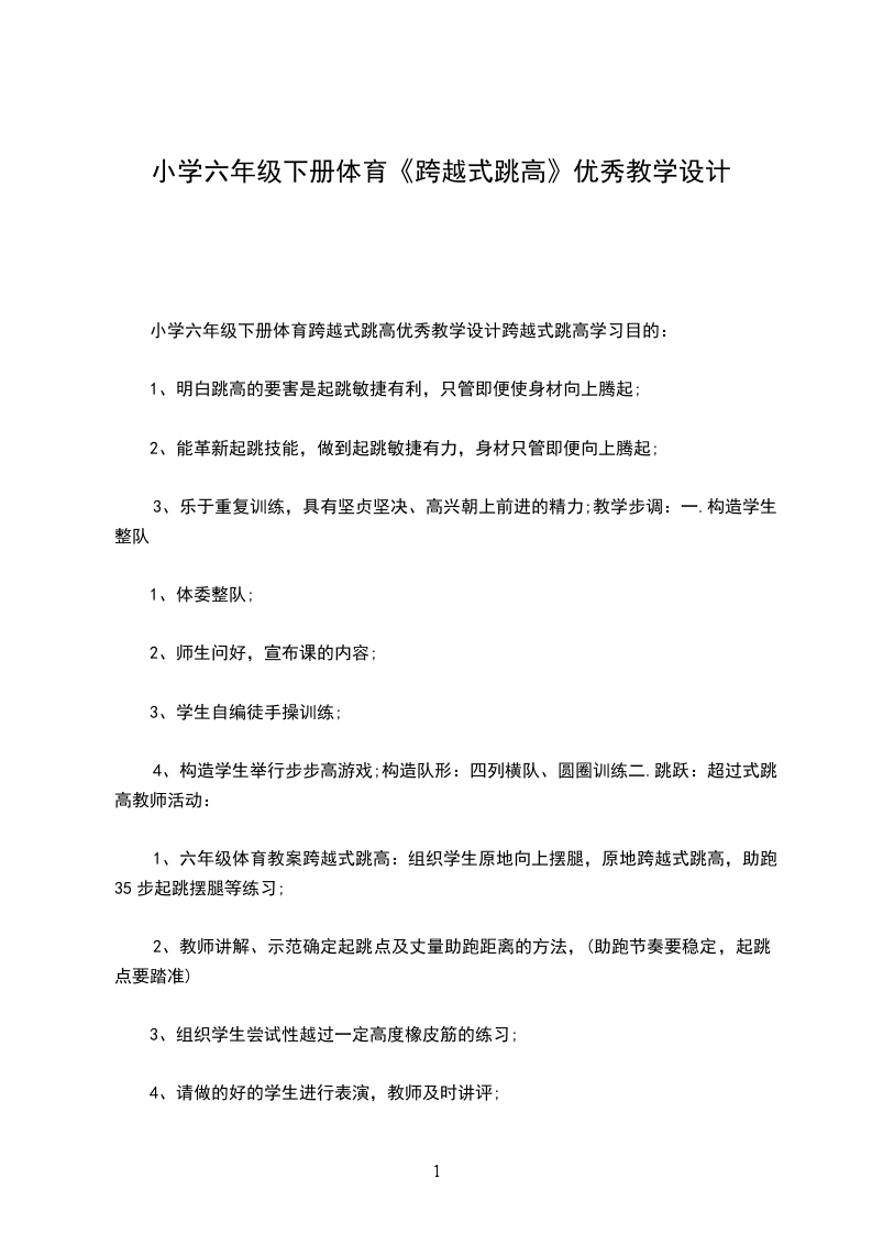 小学六年级下册体育跨越式跳高优秀教学设计跨越式跳高学习目的: