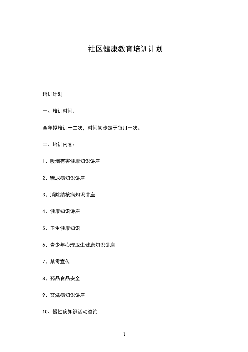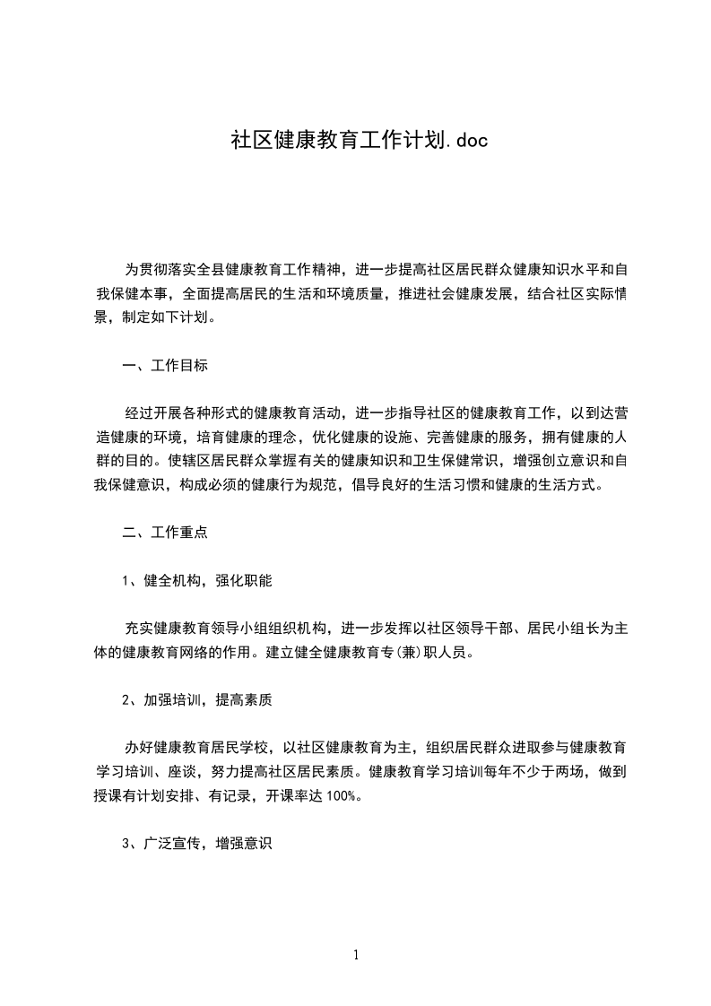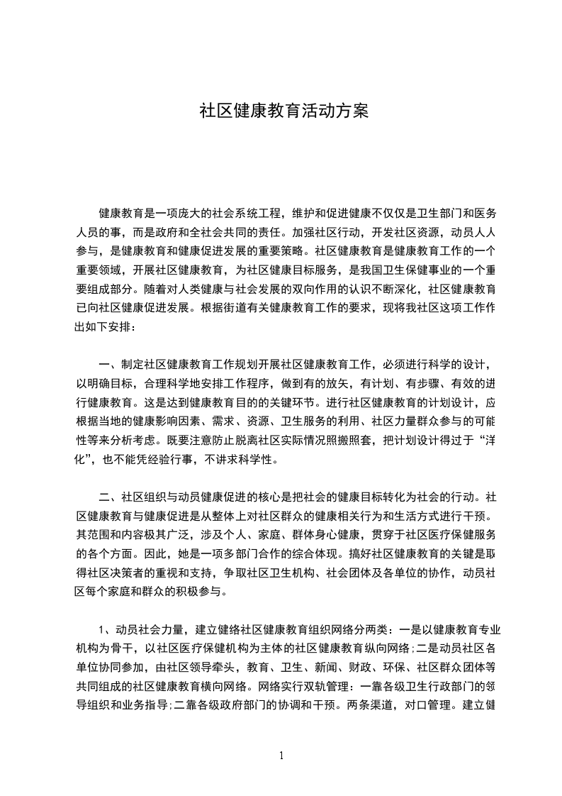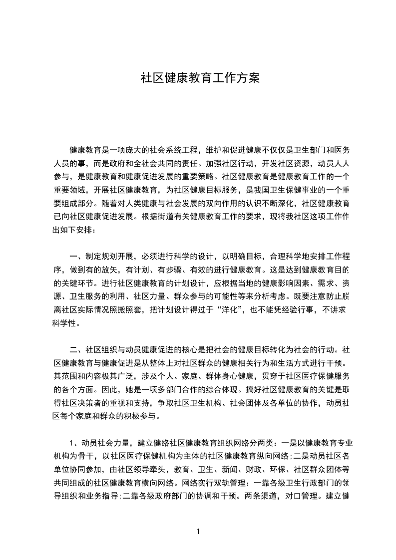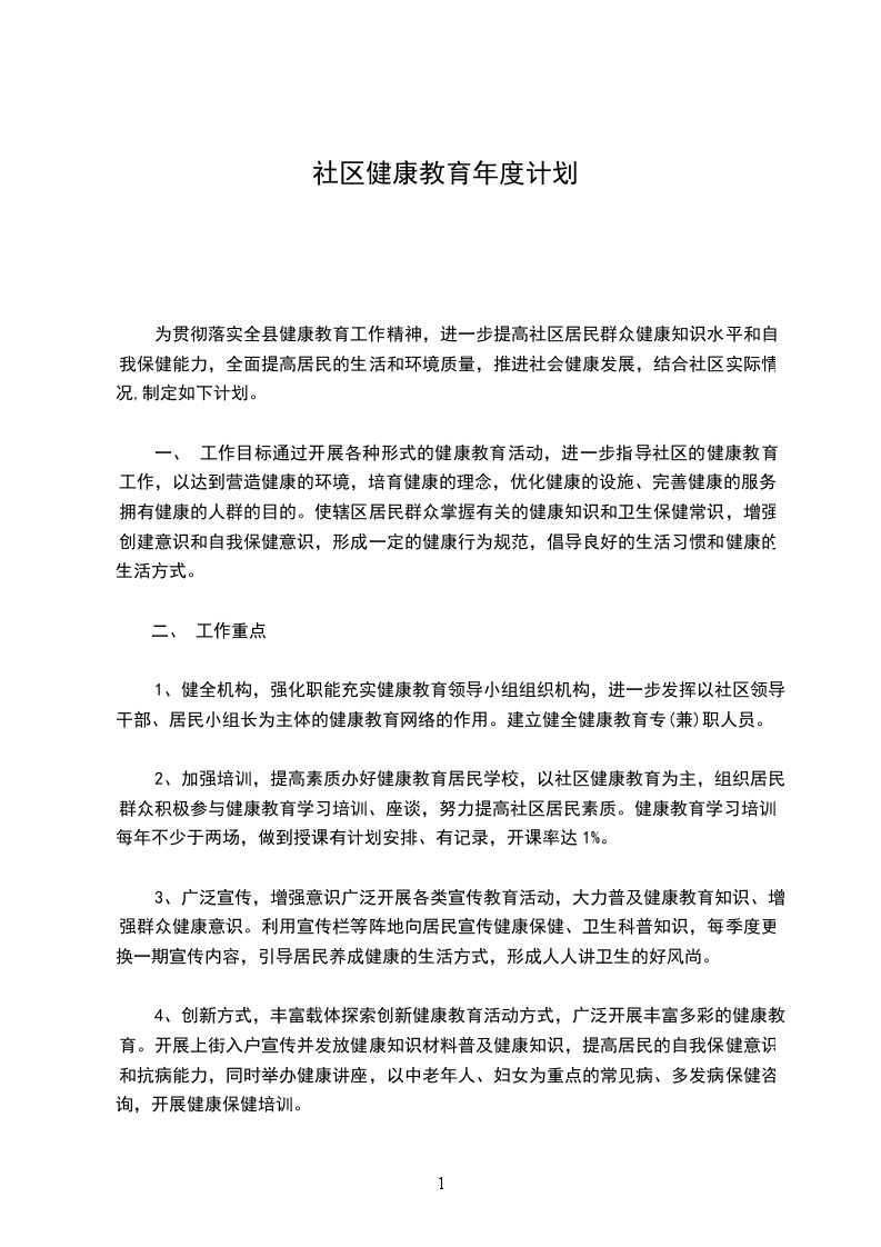 为贯彻落实全县健康教育工作精神,进一步提高社区居民群众健康知识水平和自我保健能力,全面提高居民的生活和环境质量,推进社会健康发展,结合社区实际情况,制定如下计划。