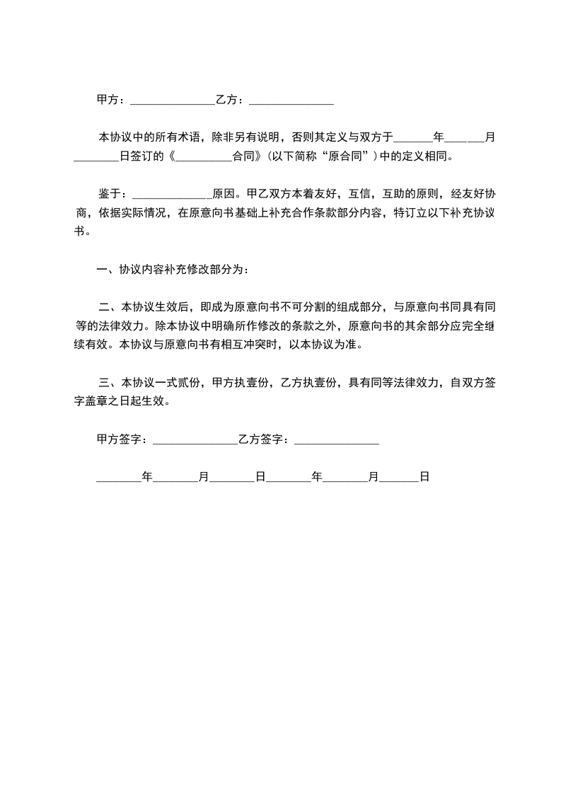 (原因) .甲乙双方本着互利互惠的原则,经友好协商,依据实际情况,在原合同基础上变更合同条款部分内容,特订立以下补充协议。