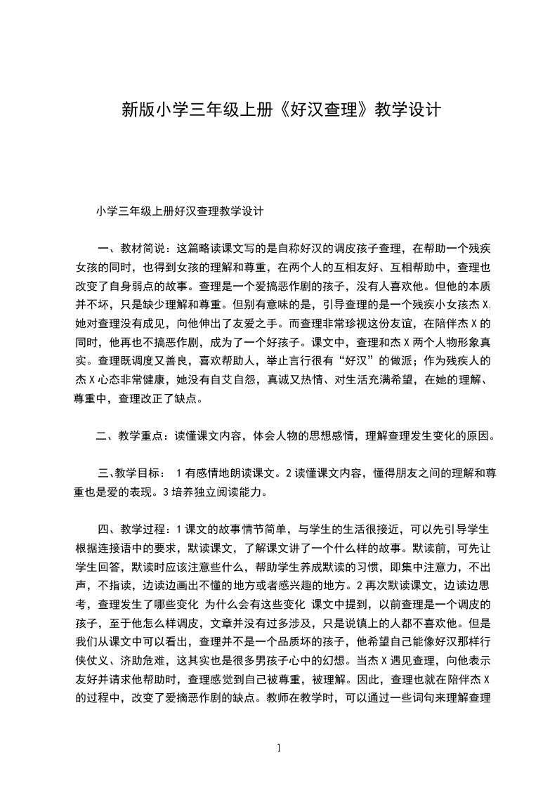 四、教学过程:1课文的故事情节简单,与学生的生活很接近,可以先引导学生根据连接语中的要求,默读课文,了解课文讲了一个什么样的故事。默读前,可先让学生回答,默读时应该注意些什么,帮助学生养成默读的习惯,即集中注意力,不出声,不指读,边读边画出不懂的地方或者感兴趣的地方。2再次默读课文,边读边思考,查理发生了哪些变化 为什么会有这些变化 课文中提到,以前查理是一个调皮的孩子,至于他怎么样调皮,文章并没有过多涉及,只是说镇上的人都不喜欢他。但是,我们从课文中可以看出,查理并不是一个品质坏的孩子,他希望自己能像好汉那样行侠仗义、济助危难,这其实也是很多男孩子心中的幻想。当杰X遇见查理,向他表示友好并请求他帮助时,查理感觉到自己被尊重,被理解。因此,查理也就在陪伴杰X的过程中,改变了爱摘恶作剧的缺点。教师在教学时,可以通过一些词句来理解查理并不是一个坏孩子,例如,“不,好汉查理从来不随便拿别人的东西”“当然可以”等。教师也可让学生联系生活实际谈谈自己读后的感受,谈一些真实的看法,如怎样看待“坏”孩子等。这也是为本单元的口语交际做一个铺垫。3本文的对话较多,除了解这些句子的意思外,还可以让学生体会说话人的神态和心理活动。教师不宜讲得过多,可以通过提问来启发学生思考。例如:“查理(杰X)说这句话时是怎么想的呢 ”“你能想象出查理(杰X)说这句话时的神态吗 在理解的基础上,教师可以重点指导一下对话的朗读,体会人物的心理活动。方式可以是男女生分别读,也可以是指名读,要尽量读出说话人的语气。