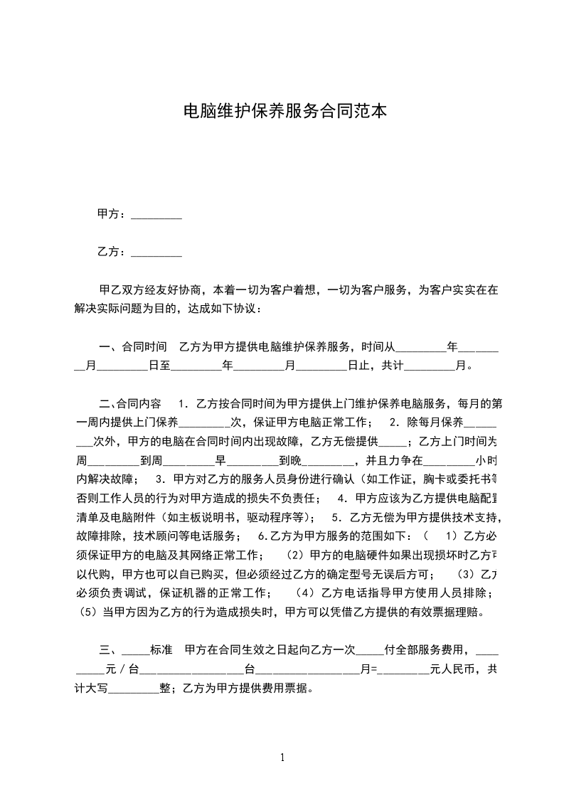 一、合同时间 乙方为甲方提供电脑维护保养服务,时间从_________年_________月_________日至_________年_________月_________日止,共计_________月。