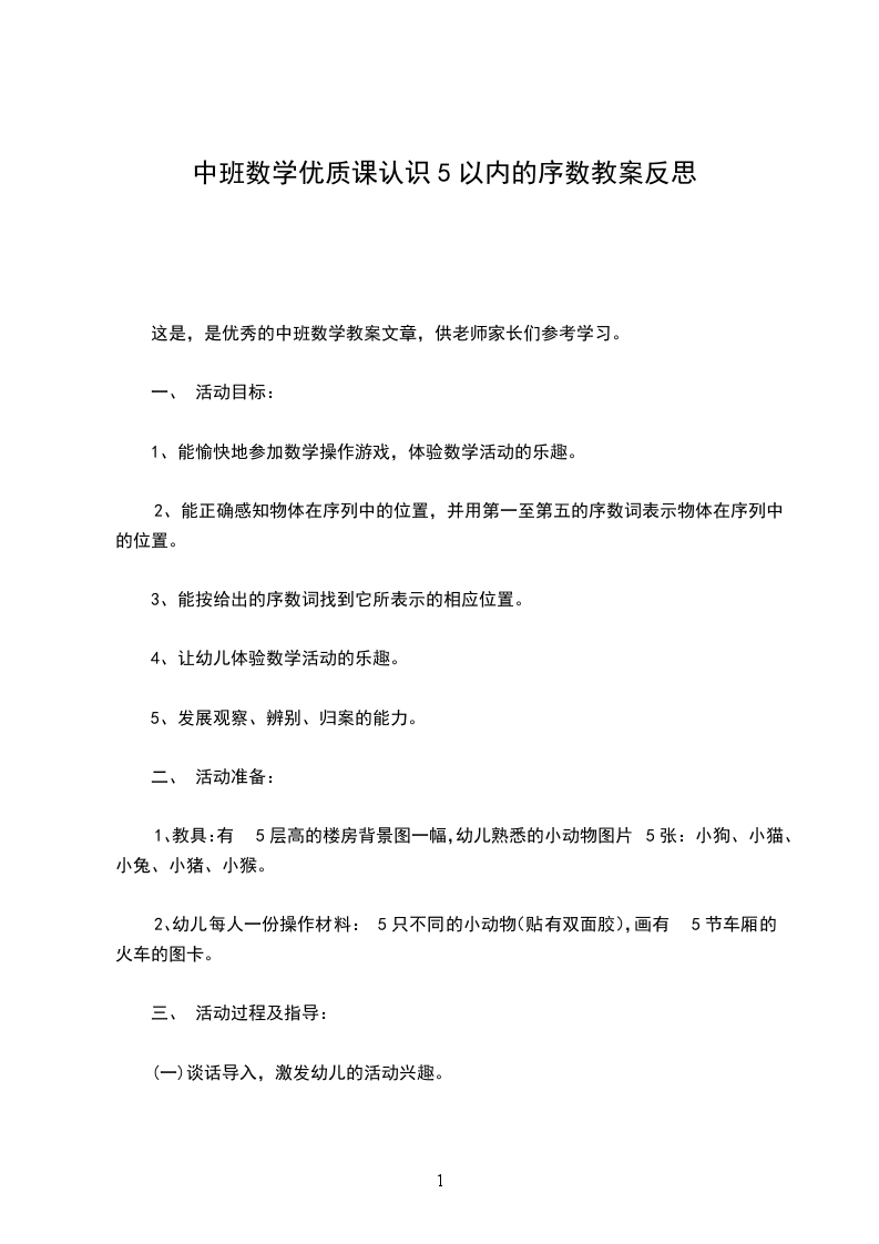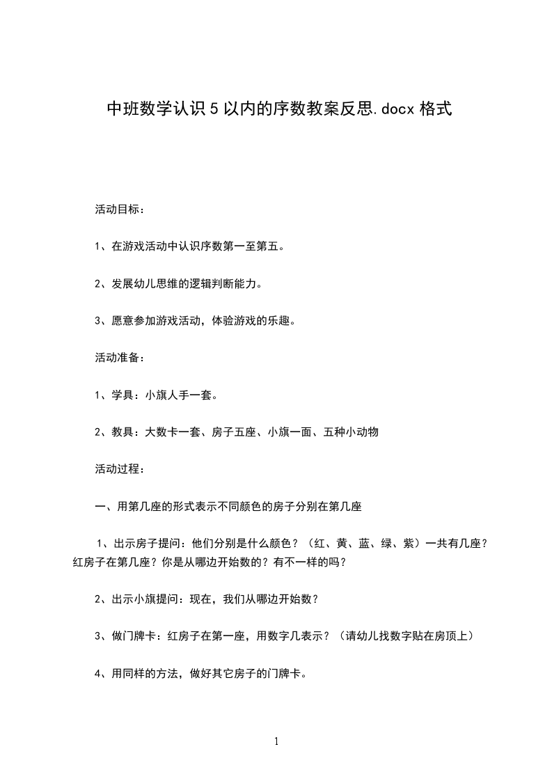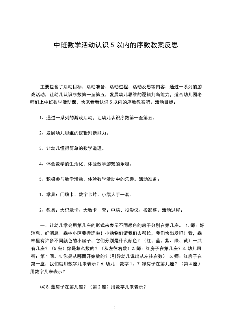 主要包含了活动设计背景,活动目标,教学重点、难点,活动准备,活动过程,教学反思等内容,能按不同方向(上下.左右)正确地从一数到十,能正确运用序数表示物体排列的顺序,体验基数与序数的关系,适合幼儿园老师们上中班数学活动课,快来看看认识10以内的序数教案吧。活动设计背景我班幼儿对于自己身边的事物特别关注,总愿意把自己觉得新奇的事物与大家一起讨论、。生活中的房子,也是孩子们关注的物体,在活动的过程中,孩子们把自己看到的房子放在一起进行比较,从中发现了我们身边的物体千姿百态、各有所用。在整个活动中,我主要采用了游戏、动脑识别的方法,配上各种图卡、形象地故事情节,使整个过程紧紧相扣、环环相连。活动目标1.能按不同方向(上下.左右)正确地从一数到十,能正确运用序数表示物体排列的顺序,体验基数与序数的关系。2.发展幼儿的观察力和判断力。3.引导幼儿积极与材料互动,体验数学活动的乐趣。4.发展幼儿逻辑思维能力。5.引发幼儿学习的兴趣。教学重点、难点1.教学重点:学习从不同的方向准确辨别物体的排列位置。2.教学难点:自己确定方向并能准确找出位置。活动准备10个贴绒动物;若干数卡;10个房间的图片。活动过程1.认识十以内的序数出示一排房子,这是小动物的家,数一数有几间,这是第二间谁能用数字表示出来,给每间房子标好号。2.正确运用序数词天亮了,公鸡起床了,它跳上自己的屋顶大声叫朋友们起床,公鸡站在第几号房顶上?小动物们起床了,老师随意从房间里拿出动物,看间房子里的起床了,引导幼儿说出序数词。小动物们准备做操了,他们从右至左排好队,现在谁排第一,排第二的是谁?再次吸引运用序数词来说明动物排队的顺序。从左往右数呢?谁排第一?谁排第二3.继续练习使用序数词请小朋友给小动物送红花,你想送花给谁就要说出:“我把花儿送给第几排的”教学反思1.整个活动,幼儿自始至终保持了浓厚的兴趣,教师与他们共同参与,起到了导向辅助的作用。2.本节课教具准备充分,游戏性、趣味性强,课堂气氛活跃,充分激发了幼儿学习积极性。