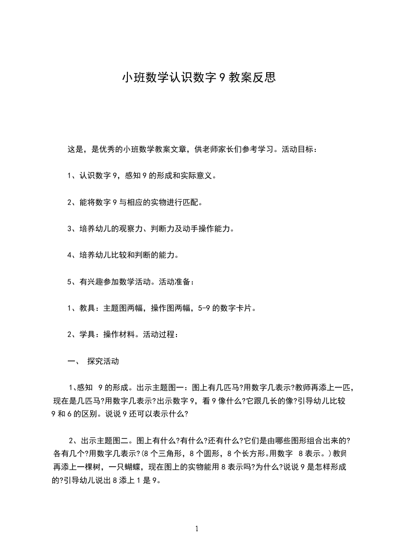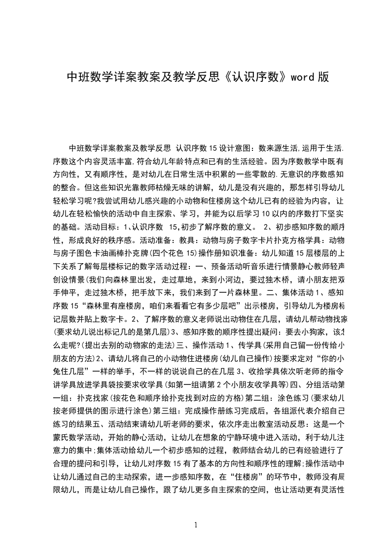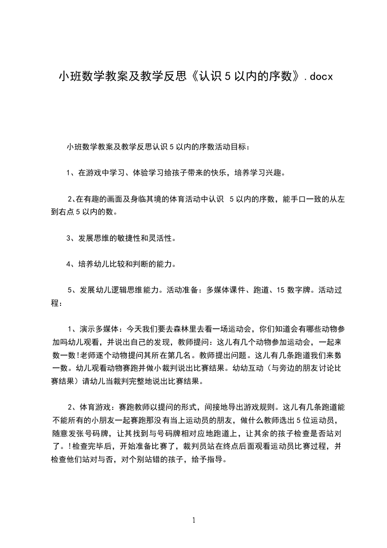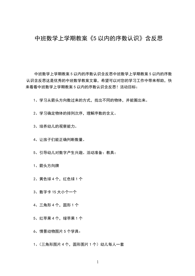 主要包含了活动设计背景,活动目标,教学重点、难点,活动准备,活动过程,教学反思等内容,能按不同方向(上下.左右)正确地从一数到十,能正确运用序数表示物体排列的顺序,体验基数与序数的关系,适合幼儿园老师们上中班数学活动课,快来看看认识10以内的序数教案吧。活动设计背景我班幼儿对于自己身边的事物特别关注,总愿意把自己觉得新奇的事物与大家一起讨论、。生活中的房子,也是孩子们关注的物体,在活动的过程中,孩子们把自己看到的房子放在一起进行比较,从中发现了我们身边的物体千姿百态、各有所用。在整个活动中,我主要采用了游戏、动脑识别的方法,配上各种图卡、形象地故事情节,使整个过程紧紧相扣、环环相连。活动目标1.能按不同方向(上下.左右)正确地从一数到十,能正确运用序数表示物体排列的顺序,体验基数与序数的关系。2.发展幼儿的观察力和判断力。3.引导幼儿积极与材料互动,体验数学活动的乐趣。4.发展幼儿逻辑思维能力。5.引发幼儿学习的兴趣。教学重点、难点1.教学重点:学习从不同的方向准确辨别物体的排列位置。2.教学难点:自己确定方向并能准确找出位置。活动准备10个贴绒动物;若干数卡;10个房间的图片。活动过程1.认识十以内的序数出示一排房子,这是小动物的家,数一数有几间,这是第二间谁能用数字表示出来,给每间房子标好号。2.正确运用序数词天亮了,公鸡起床了,它跳上自己的屋顶大声叫朋友们起床,公鸡站在第几号房顶上?小动物们起床了,老师随意从房间里拿出动物,看间房子里的起床了,引导幼儿说出序数词。小动物们准备做操了,他们从右至左排好队,现在谁排第一,排第二的是谁?再次吸引运用序数词来说明动物排队的顺序。从左往右数呢?谁排第一?谁排第二3.继续练习使用序数词请小朋友给小动物送红花,你想送花给谁就要说出:“我把花儿送给第几排的”教学反思1.整个活动,幼儿自始至终保持了浓厚的兴趣,教师与他们共同参与,起到了导向辅助的作用。2.本节课教具准备充分,游戏性、趣味性强,课堂气氛活跃,充分激发了幼儿学习积极性。