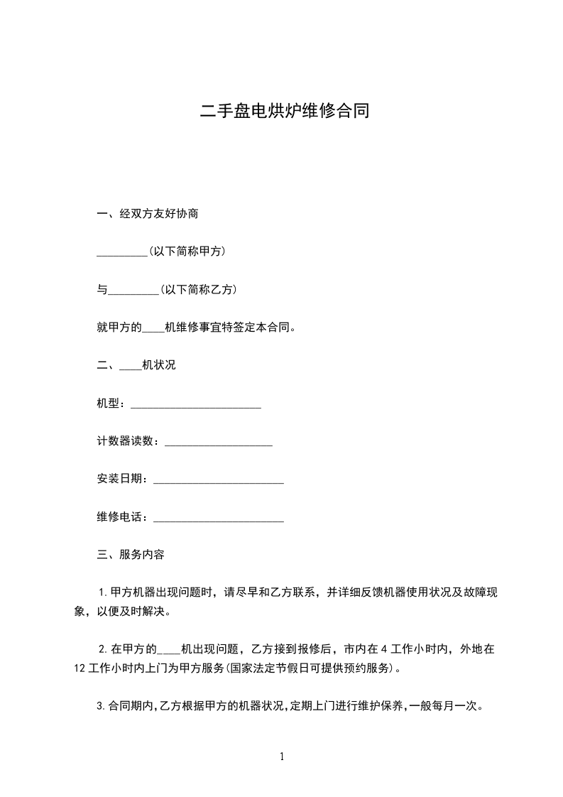 四、根据____机的状况,经双方协商,同意乙方收取甲方____机年维修费为人民币(大写)______元,(小写)¥______元。