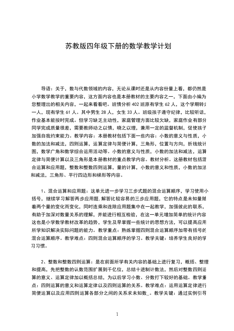 导语:关于,数与代数领域的内容,无论从课时还是从内容份量上看,都仍然是小学数学教学的重要内容,这方面内容也是本册教材的主要内容之一,下面由小编为您整理出的相关内容,一起来看看吧。班情分析402班原有学生62人,这个学期转走一人,现有学生61人。其中男生28人,女生33人。班级孩子遵守纪律,比较听话,作业基本能按时完成。但学习缺乏主动性,家庭管理方面比较欠缺,家庭作业有部分同学完成质量很差,需要教师动之以情,晓之以理,兼用一定的监督机制,促使孩子加强自我约束能力。教学内容:本册教材包括下面一些内容:小数的意义与性质,小数的加法和减法,四则运算,运算定律与简便计算,三角形,位置与方向,折线统计图,数学广角和数学综合运用活动等。小数的意义与性质,小数的加法和减法,运算定律与简便计算以及三角形是本册教材的重点教学内容。教材分析。这册教材包括混合运算和应用题,整数和整数四则运算,量的计算,小数的意义和性质,小数的加法和减法,三角形、平行四边形和梯形等内容。
