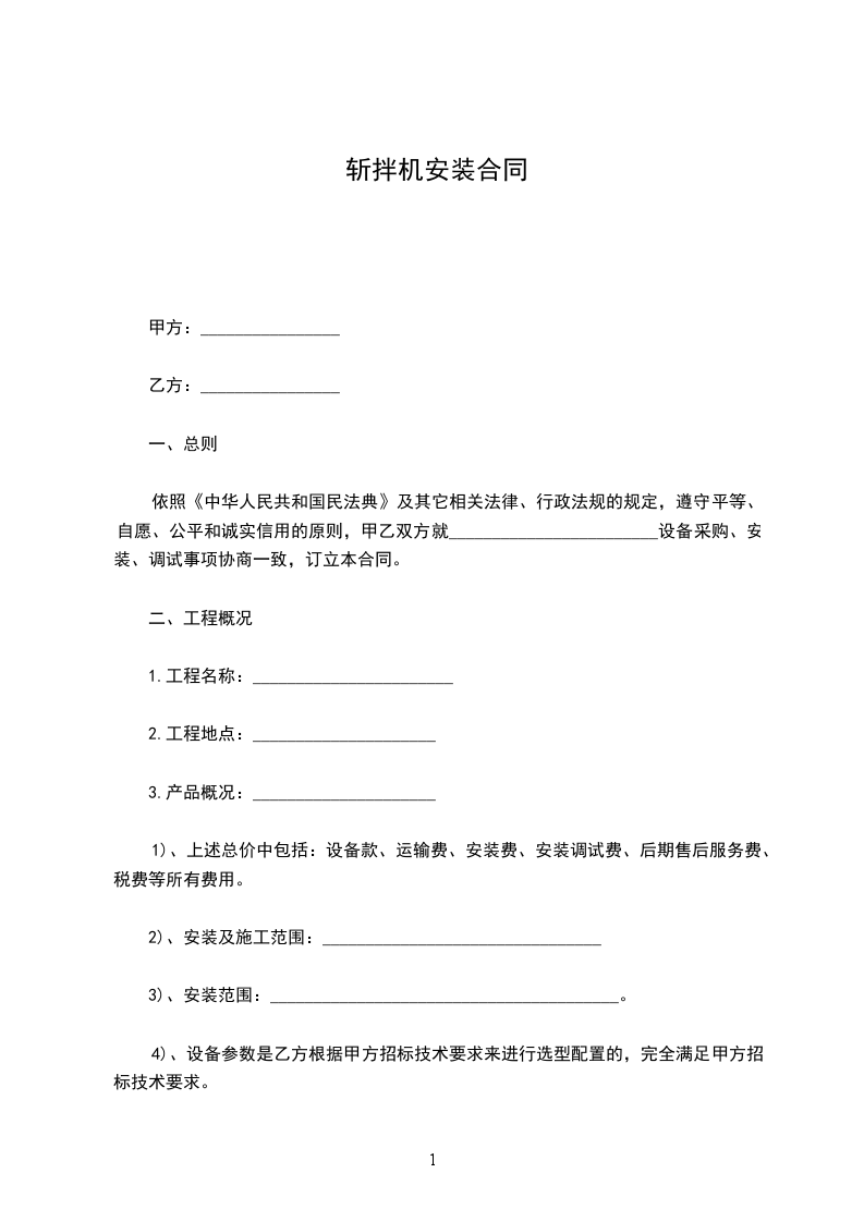 依照《中华人民共和国民法典》及其它相关法律、行政法规的规定,遵守平等、自愿、公平和诚实信用的原则,甲乙双方就________________________设备采购、安装、调试事项协商一致,订立本合同。