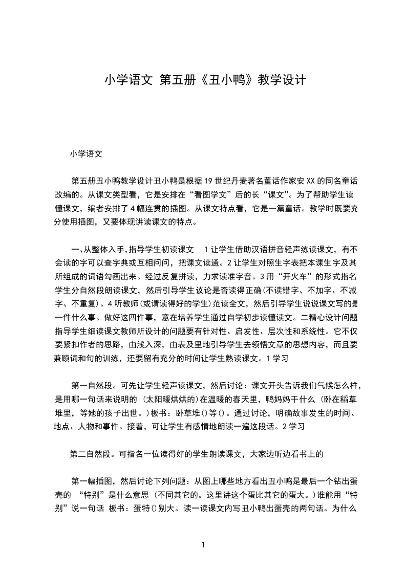 第五册丑小鸭教学设计丑小鸭是根据19世纪丹麦著名董话作家安XX的同名童话改编的。从课文类型看,它是安排在“看图学文”后的长“课文”。为了帮助学生读懂课文,编者安排了4幅连贯的插图。从课文特点看,它是一篇童话。教学时既要充分使用插图,又要体现讲读课文的特点。