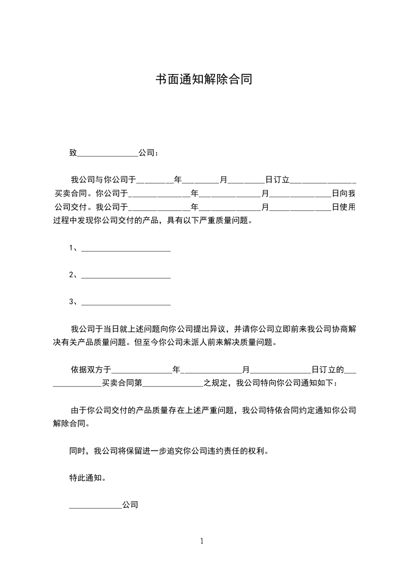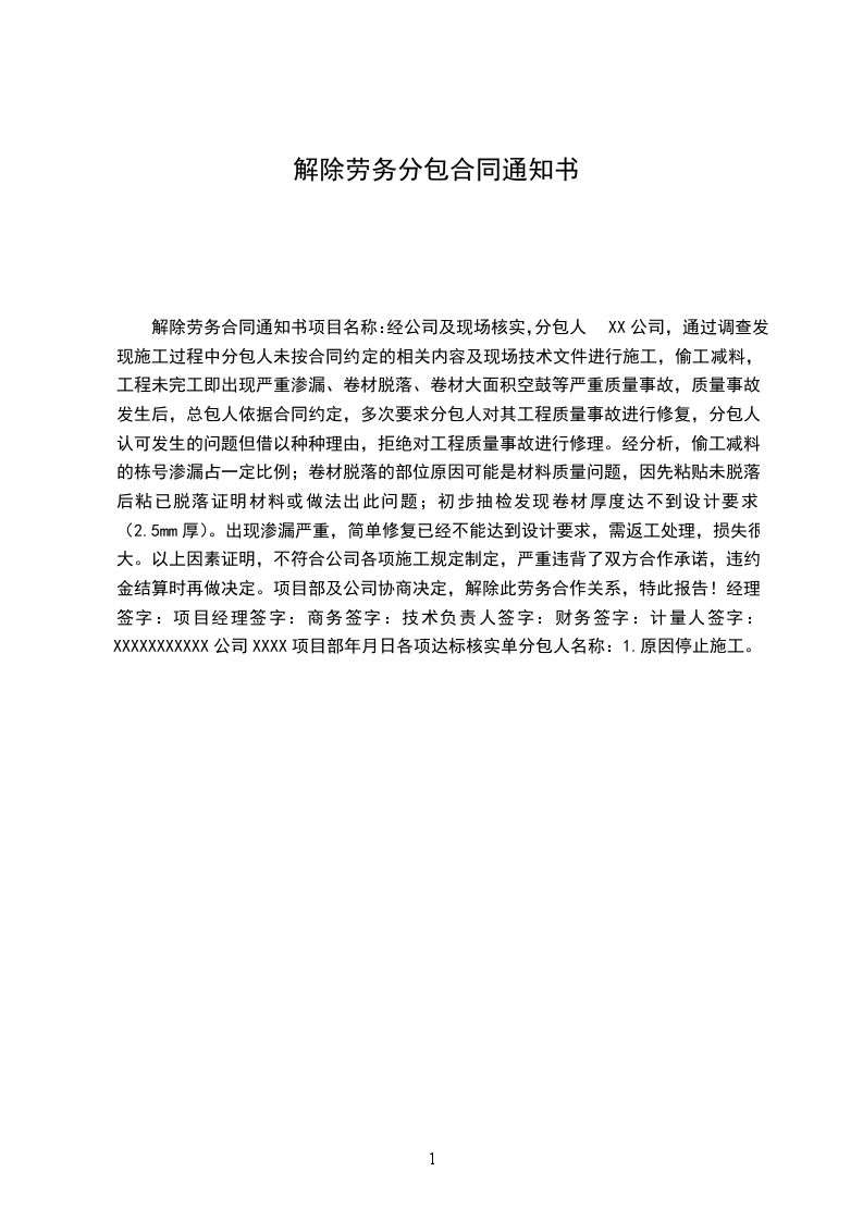 解除劳务合同通知书项目名称:经公司及现场核实,分包人XX公司,通过调查发现施工过程中分包人未按合同约定的相关内容及现场技术文件进行施工,偷工减料,工程未完工即出现严重渗漏、卷材脱落、卷材大面积空鼓等严重质量事故,质量事故发生后,总包人依据合同约定,多次要求分包人对其工程质量事故进行修复,分包人认可发生的问题但借以种种理由,拒绝对工程质量事故进行修理。经分析,偷工减料的栋号渗漏占一定比例;卷材脱落的部位原因可能是材料质量问题,因先粘贴未脱落后粘已脱落证明材料或做法出此问题;初步抽检发现卷材厚度达不到设计要求(2.5mm厚)。出现渗漏严重,简单修复已经不能达到设计要求,需返工处理,损失很大。以上因素证明,不符合公司各项施工规定制定,严重违背了双方合作承诺,违约金结算时再做决定。项目部及公司协商决定,解除此劳务合作关系,特此报告!经理签字:项目经理签字:商务签字:技术负责人签字:财务签字:计量人签字:XXXXXXXXXXX公司XXXX项目部年月日各项达标核实单分包人名称:1.原因停止施工。