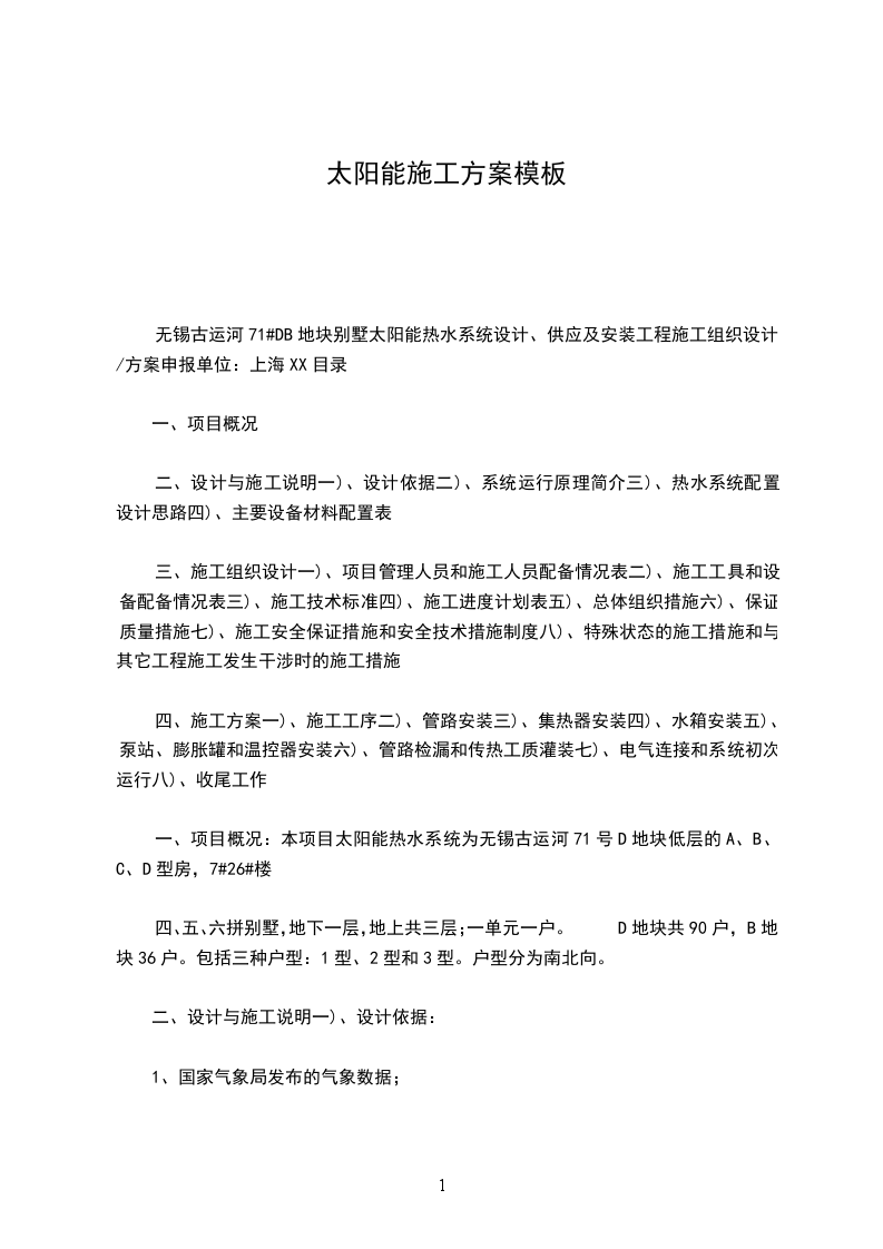 无锡古运河71#DB地块别墅太阳能热水系统设计、供应及安装工程施工组织设计/方案申报单位:上海XX目录