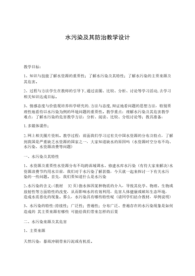 3、情感态度与价值观培养科学研究的.方法与态度,辩证地看问题的思想方法,特别要理性地看待以水污染为例的环境问题的重要性。教学重点:理解水污染及其危害教学难点:了解水污染的危害教学方法:分析、阅读、比较、分组讨论等;教具准备: