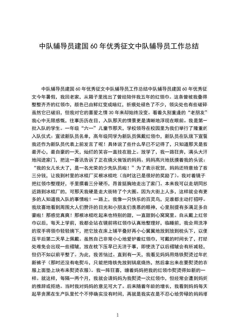 中队辅导员建国60年优秀征文中队辅导员工作总结中队辅导员建国60年优秀征文今年暑假,我回老家,从箱子里找出了曾经陪伴我五年的红领巾。这条曾被我叠得整整齐齐的红领巾,颜色已由鲜红变成暗红,折痕处褪色了不少,领尖处也有些破碎。虽然它已破旧,但我对它的喜爱之情30年来却始终没变。看着久别重逢的“老朋友”,我心中无限感慨,往事历历在目,入队那天的情景更是清晰地浮现在眼前。我是第一批入队的学生。一年级“六一”儿童节那天,学校领导在校园里为我们举行了隆重的入队仪式:宣读新队员名单,高年级同学为新队员佩戴红领巾,新队员在队旗下宣誓我还作为新队员代表上前发言了呢!具体说了些什么早已不记得了,只知道那天是我最开心,最自豪的一天,灿烂的笑容一直挂在脸上。放学了,我一路狂奔,满头大汗地闯进家门,把这一喜讯告诉了正在烧火做饭的妈妈。妈妈高兴地抚摸着我的头说:“我的女儿长大了,是一名光荣的少先队员啦!”为了表示祝贺,妈妈还特意给了我三分钱,让我到村里的冰棍厂买根冰棍吃(当时这已是很好的奖励了)。我对着镜子把红领巾整理好,手里撰着三分硬币,昂首挺胸地走出了家门。本来我可以走胡同抄近路到冰棍厂的,可那天我硬是走大街转了个大圈。因为大街上人多,这样就会有更多的人知道我入队的事情啦!一路上,我像一只快乐的百灵鸟,见谁都主动打招呼。我欣喜地看到周围大人们赞许的目光和小朋友们羡慕的眼神,心里别提有多满足多自豪啦!那感觉真爽!那根冰棍吃起来也特别的甜,一直甜到心窝窝里。自从戴上红领巾以后,每天上学前,我都会站在镜前将红领巾认真地整理好,临睡前,我会用洗净的双手将领巾轻轻摘下,把它放在床上铺平叠好再小心翼翼地放到放到枕头下,以便压平后第二天早上佩戴。虽然自己非常小心地爱护着红领巾,可戴的时间长了,打结处难免会出现一些褶皱,放在枕下压早已无济于事,即使洗了以后褶皱会有所减轻,但仍不如以前平整了。为此,我苦恼过。直到有一天,我看见妈妈用烙铁熨烫过年的新裤子(那时还没有电熨斗,只能把烙铁先放到锅底烧热,然后拿出来在要熨烫的衣服上面垫上块布来熨烫衣服)。我一阵狂喜,缠着妈妈把我的红领巾熨烫得如新的一样。就这样,每隔一两个月,我就会请妈妈为我熨烫一次红领巾,但经常会遭到妈妈的推辞或拒绝。当时我对妈妈的意见可大了。后来随着年龄的增长,我看到妈妈每天起早贪黑在生产队里忙个不停确实没有时间,再就是我实在是不忍心给劳碌的妈妈增添负担。我决心自己试着用烙铁来熨烫。俗话说得好“看花容易绣花难”,这句话一点不假。熨衣服时,烙铁的温度一定得控制好。温度太高容易把衣物烧坏,温度过低又达不到好的效果。为了心爱的红领巾,我反复试验着。“功夫不负有心人”我终于掌握了这一技术活。这样自己动手熨烫红领巾的次数明显增多了,同学们见我佩戴的红领巾天天崭新平整都非常羡慕。小学毕业了,我把红领巾洗干净熨平整叠整齐,我知道这是我最后一次做这些了,所以做起来格外用心。我把红领巾珍藏在箱子里,把对红领巾的那份爱深深地埋在了心底。怀着对红领巾的这份挚爱之情,我毅然跨入了师范的大门。工作十八年来,每天与“红领巾”相伴,使我真切地感受到了作为一名中队辅导员的幸福与快乐!今后,我将永葆一颗童心,一如既往地爱着红领巾,并将这份爱代代传承下去。