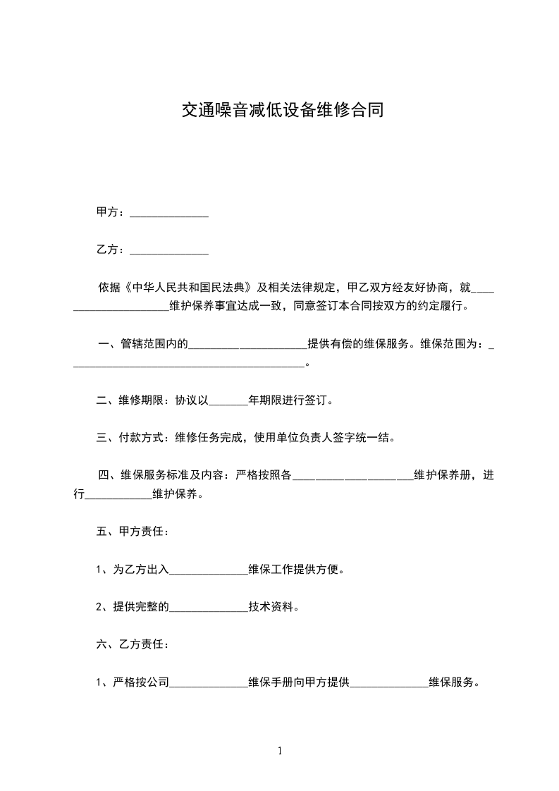 依据《中华人民共和国民法典》及相关法律规定,甲乙双方经友好协商,就_____________________维护保养事宜达成一致,同意签订本合同按双方的约定履行。
