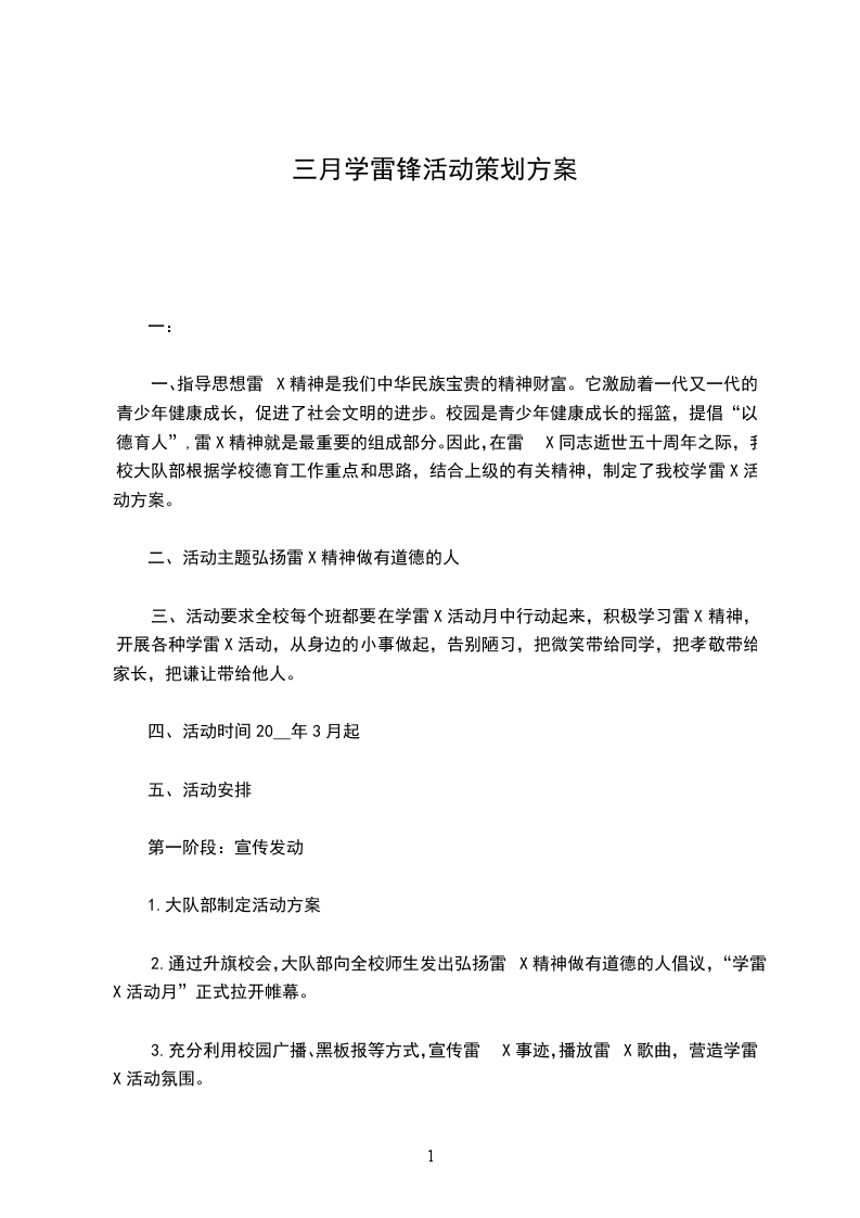 第三阶段:总结表彰三月底,进行“学雷X活动月”情况总结,并将活动信息及照片上报区教育局德育办、区团委、黑龙江朝文报等部门,通过升旗校会,评选出“雷X班”、“雷X式好少年”进行表彰奖励。二:为进一步贯彻落实党的十八大精神,大力弘扬雷X精神和志愿服务精神。学校拟在3月开展“千万个雷X在成长”学雷X主题活动,全面营造“学雷X,做小小志愿者”的浓厚氛围,进一步推动学雷X活动的常态深入开展。