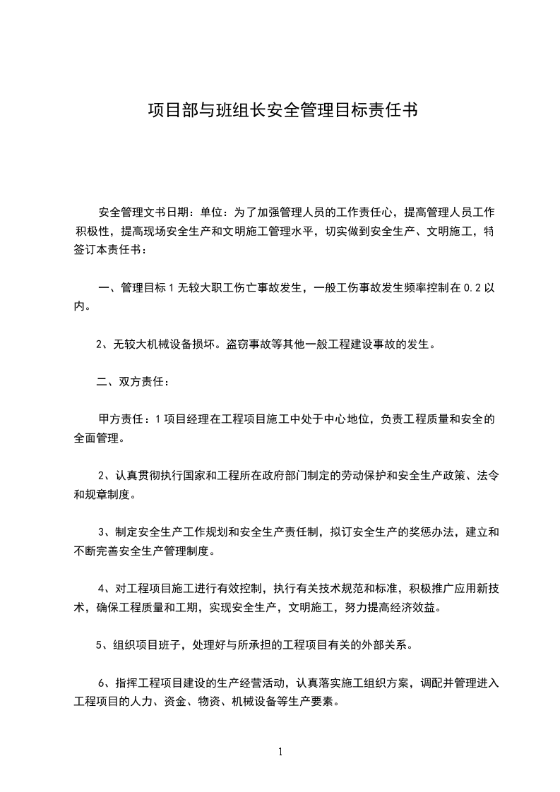 四、奖惩办法:甲方对乙方的奖惩办法参照总公司与项目部所签订的安全生产目标责任书中的奖惩办法执行,所奖罚的金额为总公司对项目部奖罚金额的5%。甲方(项目经理):班组长:签名签名日期:单位: