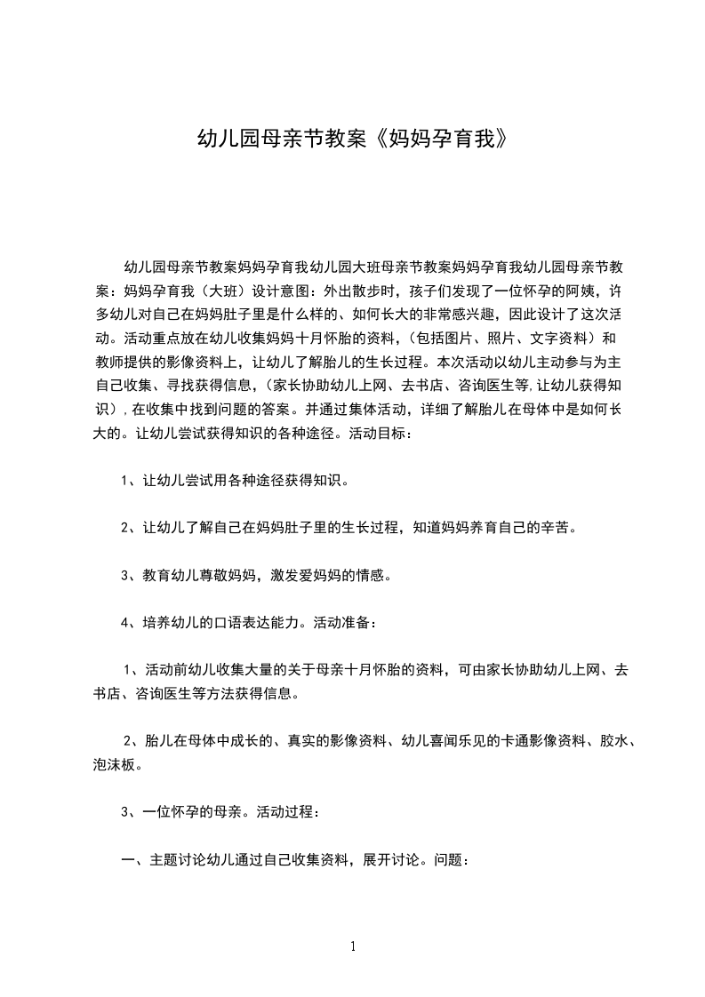 (3)讲一个关于妈妈的故事,让幼儿进一步感受到母爱的伟大。小朋友做了一天的妈妈都感到非常的辛苦,可妈妈要做10个月才能生下宝宝,下面我就讲一个关于妈妈的故事。(故事略)