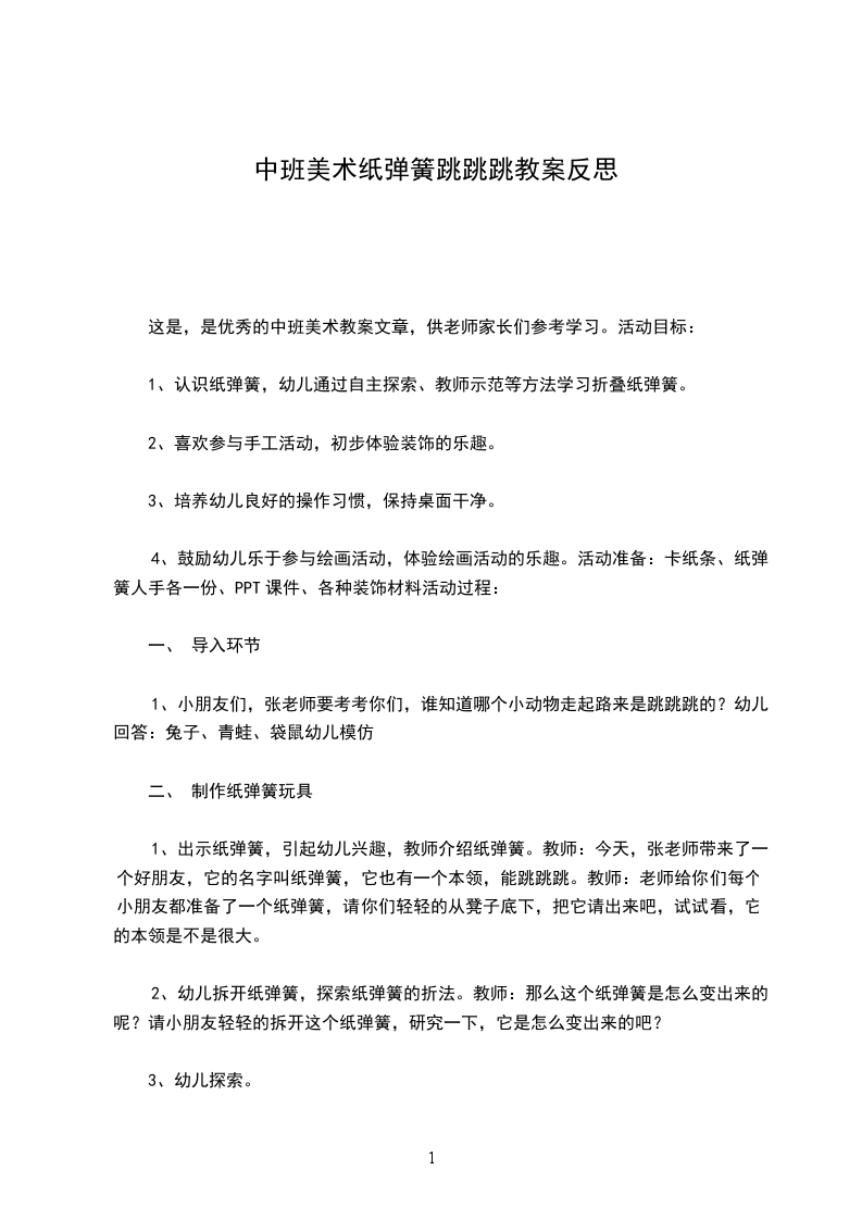 1、出示纸弹簧,引起幼儿兴趣,教师介绍纸弹簧。教师:今天,张老师带来了一个好朋友,它的名字叫纸弹簧,它也有一个本领,能跳跳跳。教师:老师给你们每个小朋友都准备了一个纸弹簧,请你们轻轻的从凳子底下,把它请出来吧,试试看,它的本领是不是很大。