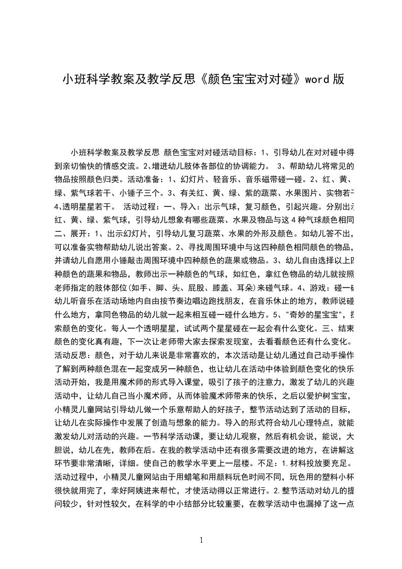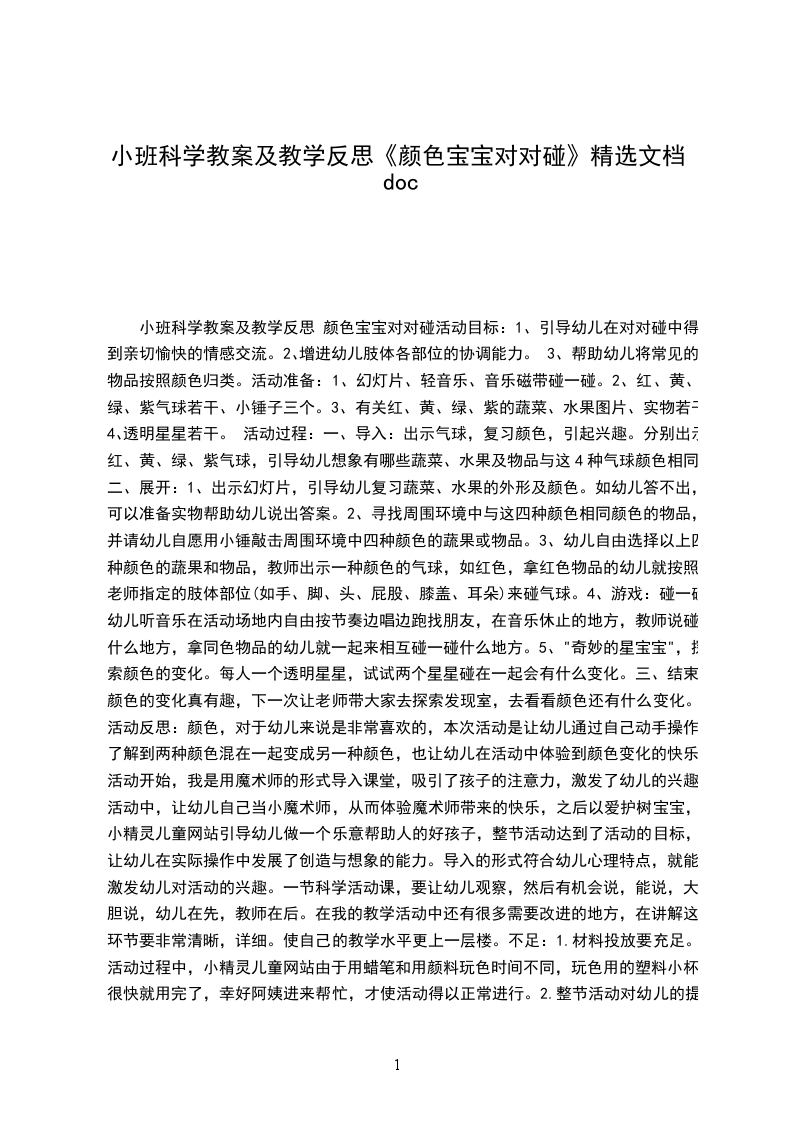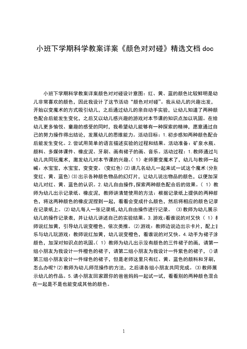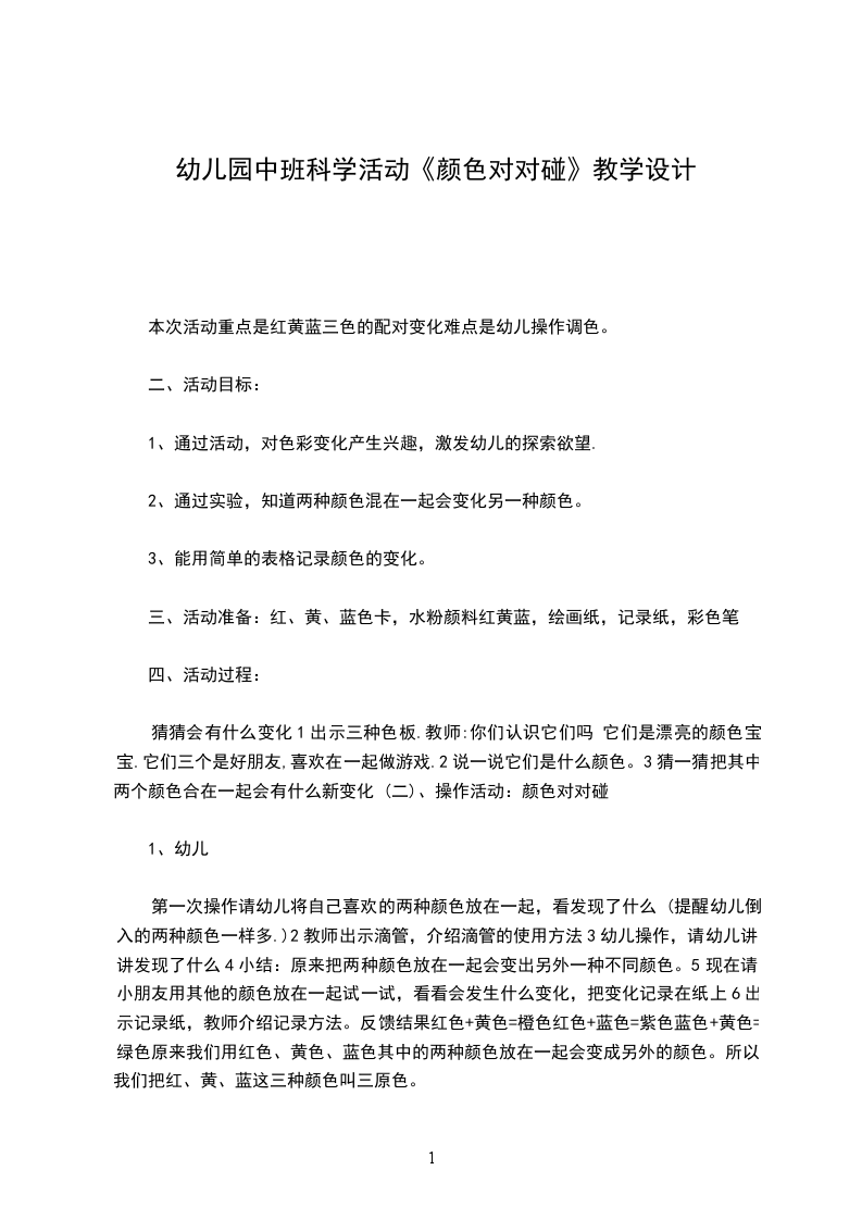 猜猜会有什么变化1出示三种色板.教师:你们认识它们吗 它们是漂亮的颜色宝宝.它们三个是好朋友,喜欢在一起做游戏.2说一说它们是什么颜色。3猜一猜把其中两个颜色合在一起会有什么新变化 (二)、操作活动:颜色对对碰