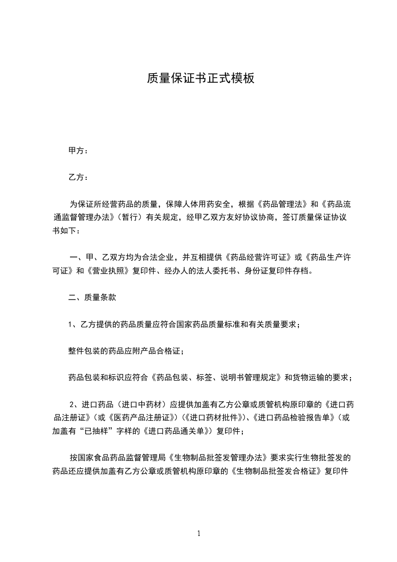 为保证所经营药品的质量,保障人体用药安全,根据《药品管理法》和《药品流通监督管理办法》(暂行)有关规定,经甲乙双方友好协议协商,签订质量保证协议书如下: